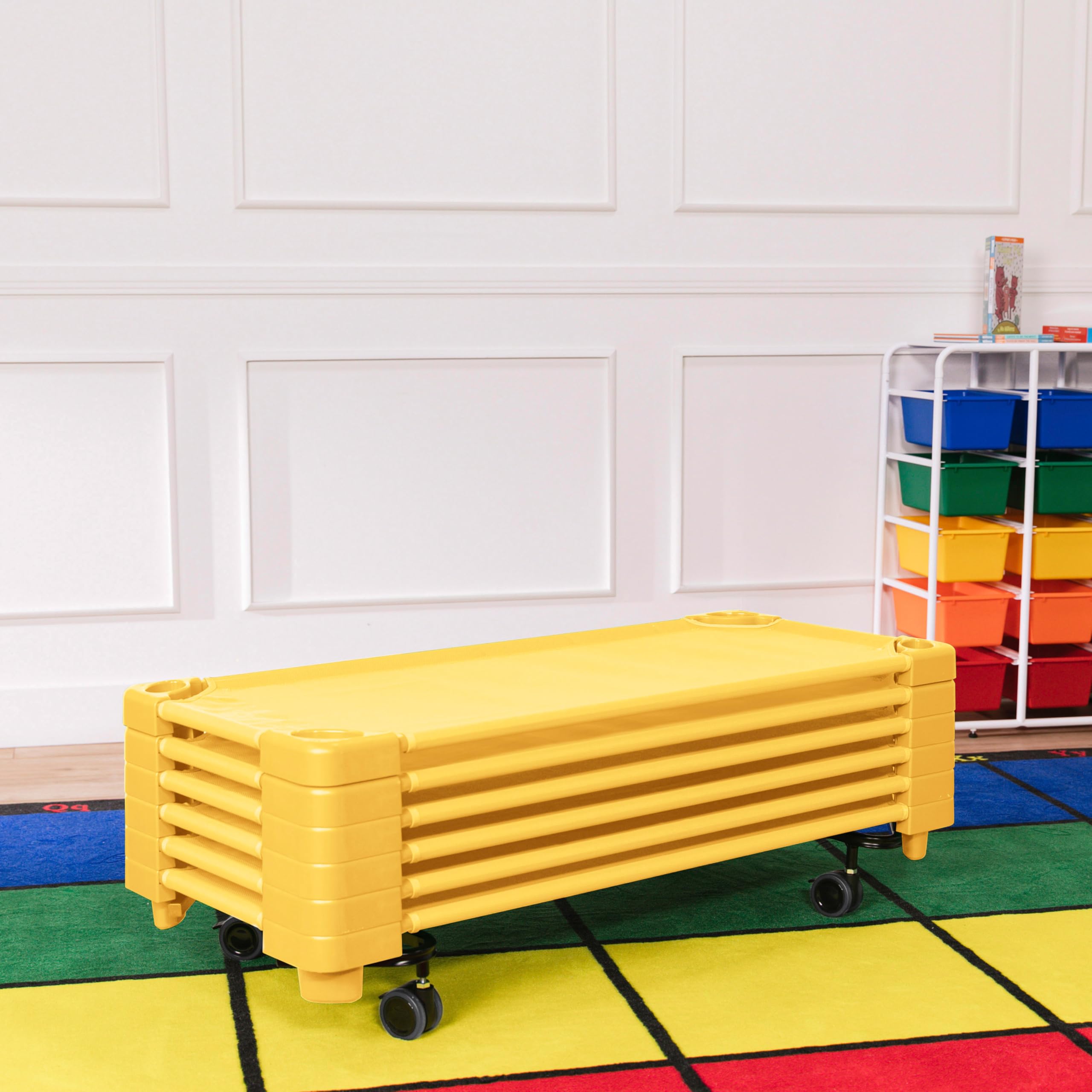 Rest Time Ready: Six stackable cots for sleeping and a mobile storage trolley for rest time in childcare centers; keep little ones elevated off the floor for comfort, airflow, and a stable sleeping surface