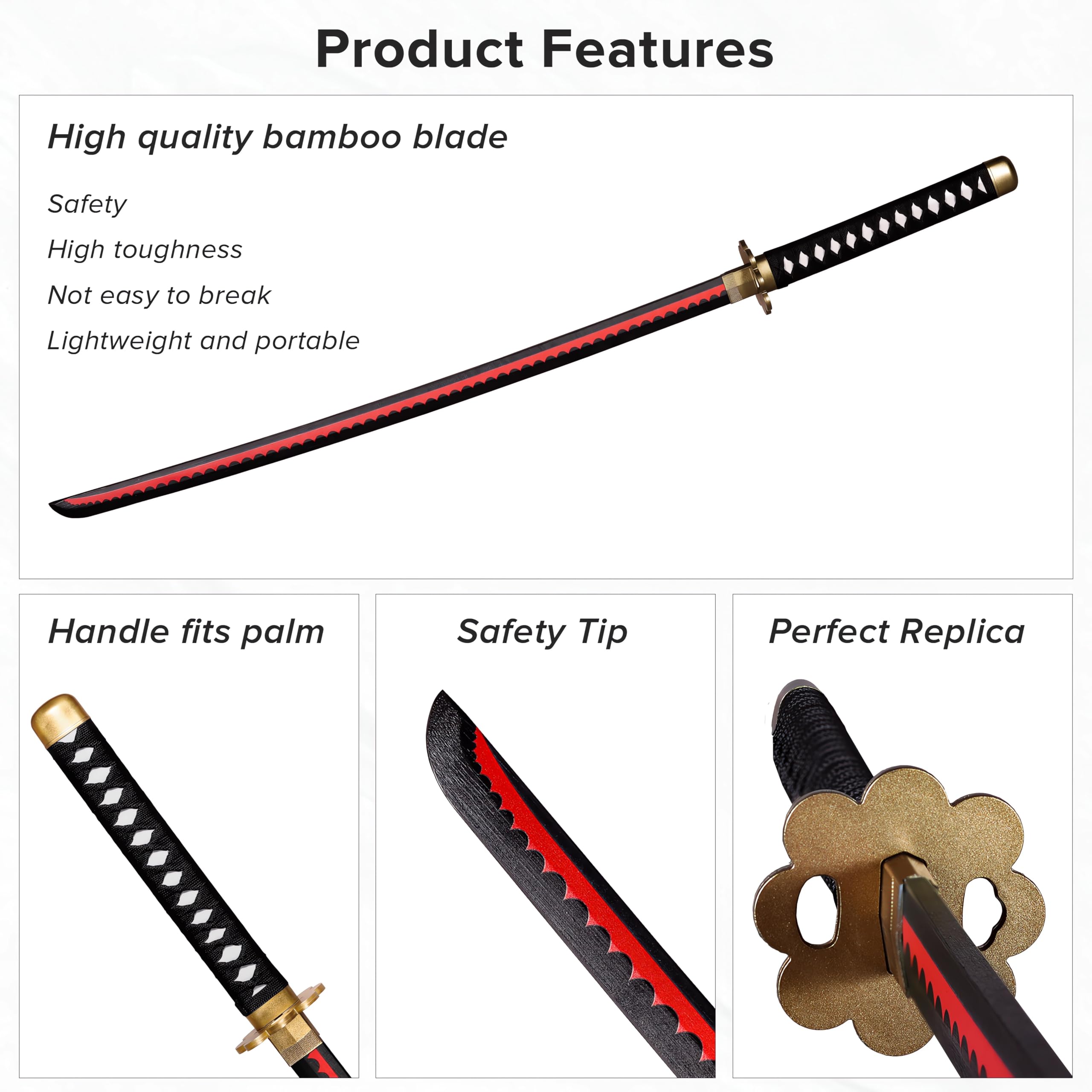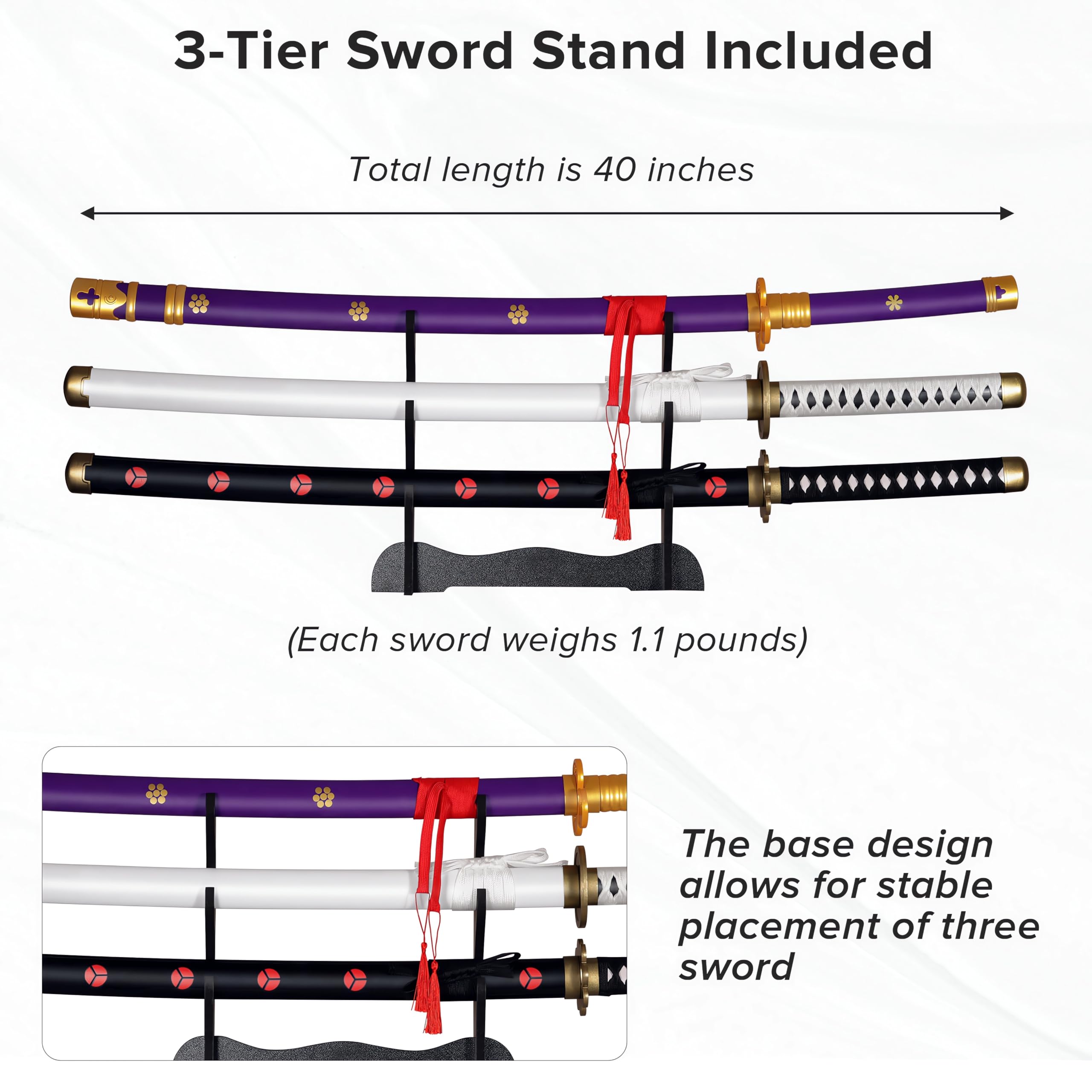 Get the ultimate Zoro decoration collection with the 41 inch Bamboo Cosplay Swords set, featuring Wado Ichimonji, Yama Enma, and Shusui, perfect for cosplay and stage performances.