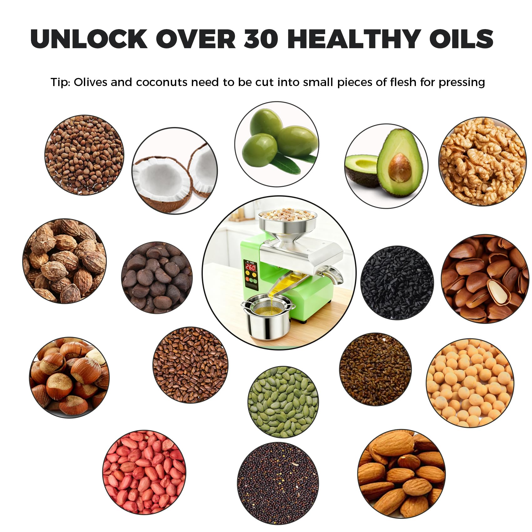 【Multi-Purpose Use】This product can press over 30 types of raw materials, including castor,coconuts,peanuts,nuts,soybeans,dried avocados, and white olive kernels