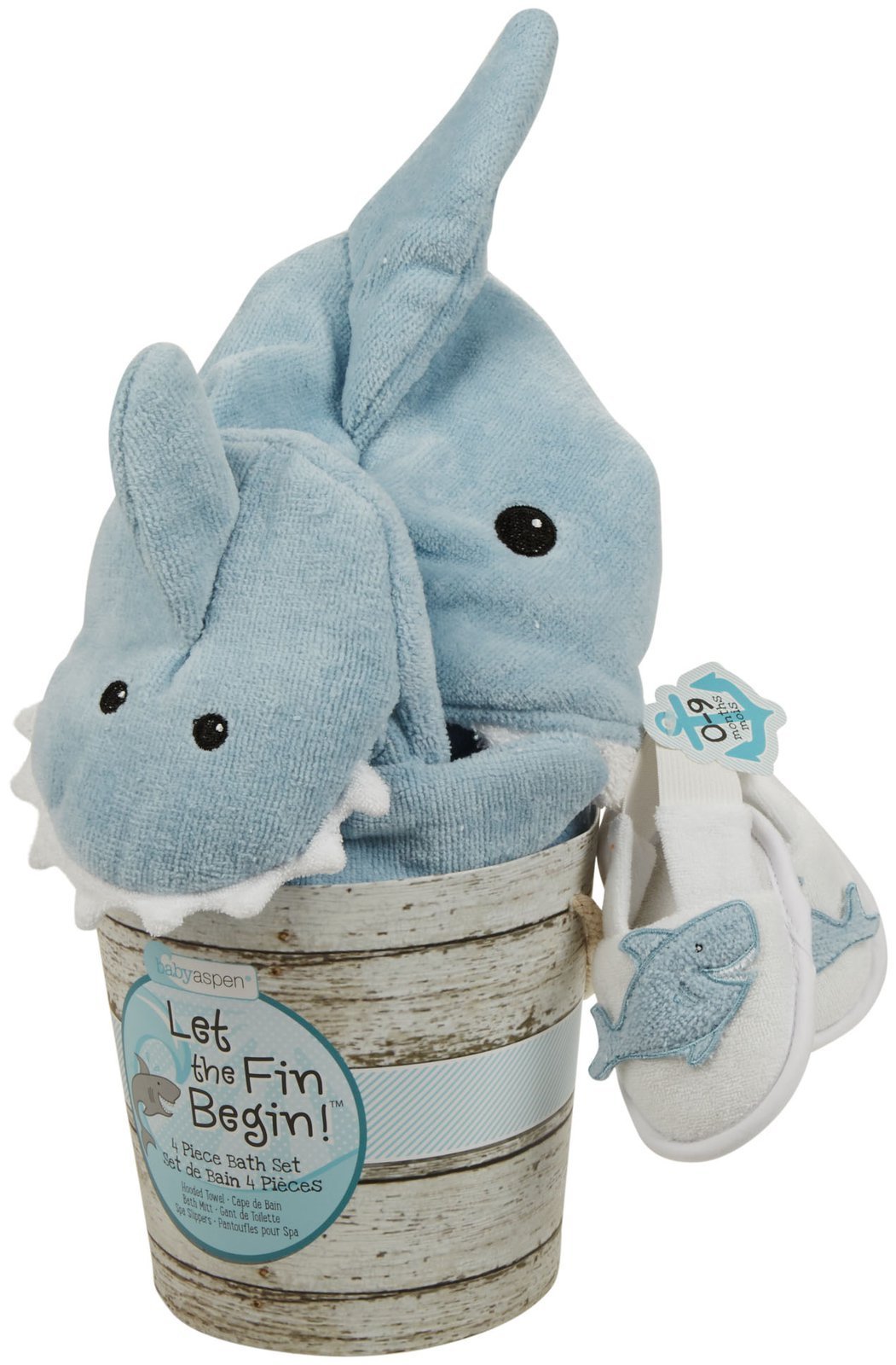 Deluxe 4-Piece Shark Bath Set – Make a splash with Baby Aspen’s baby shark hooded towel set, which includes a sea blue cotton hooded baby towel, matching bath mitt, and two baby slippers—all designed with 3-D fins, tails, teeth, and cute appliquéd shark faces. Perfect for baby shower gifts or nursery décor, this charming baby robe and towel combo adds beachy, coastal fun to any baby boy gift. Moms and party hosts love this whimsical baby bath towel set for themed events and photo-ready moments.