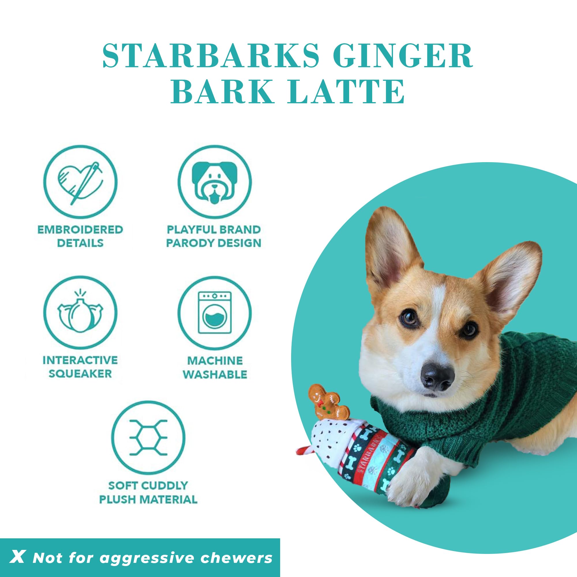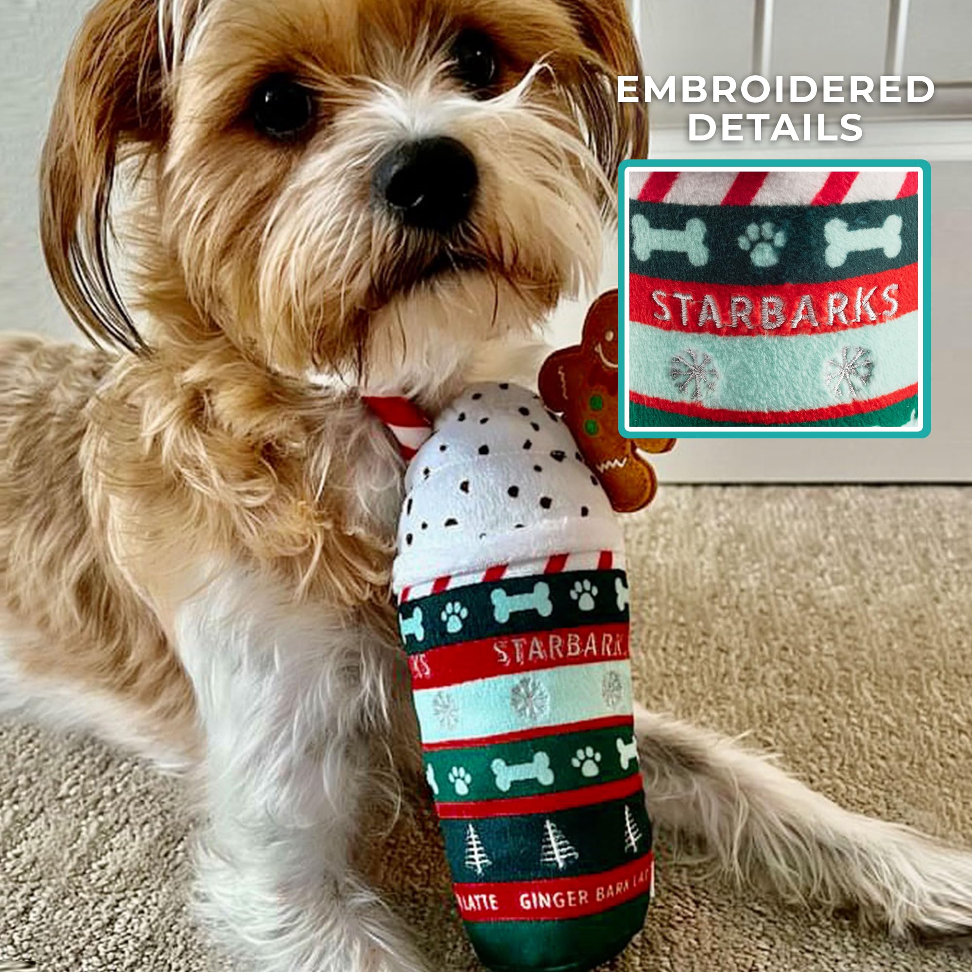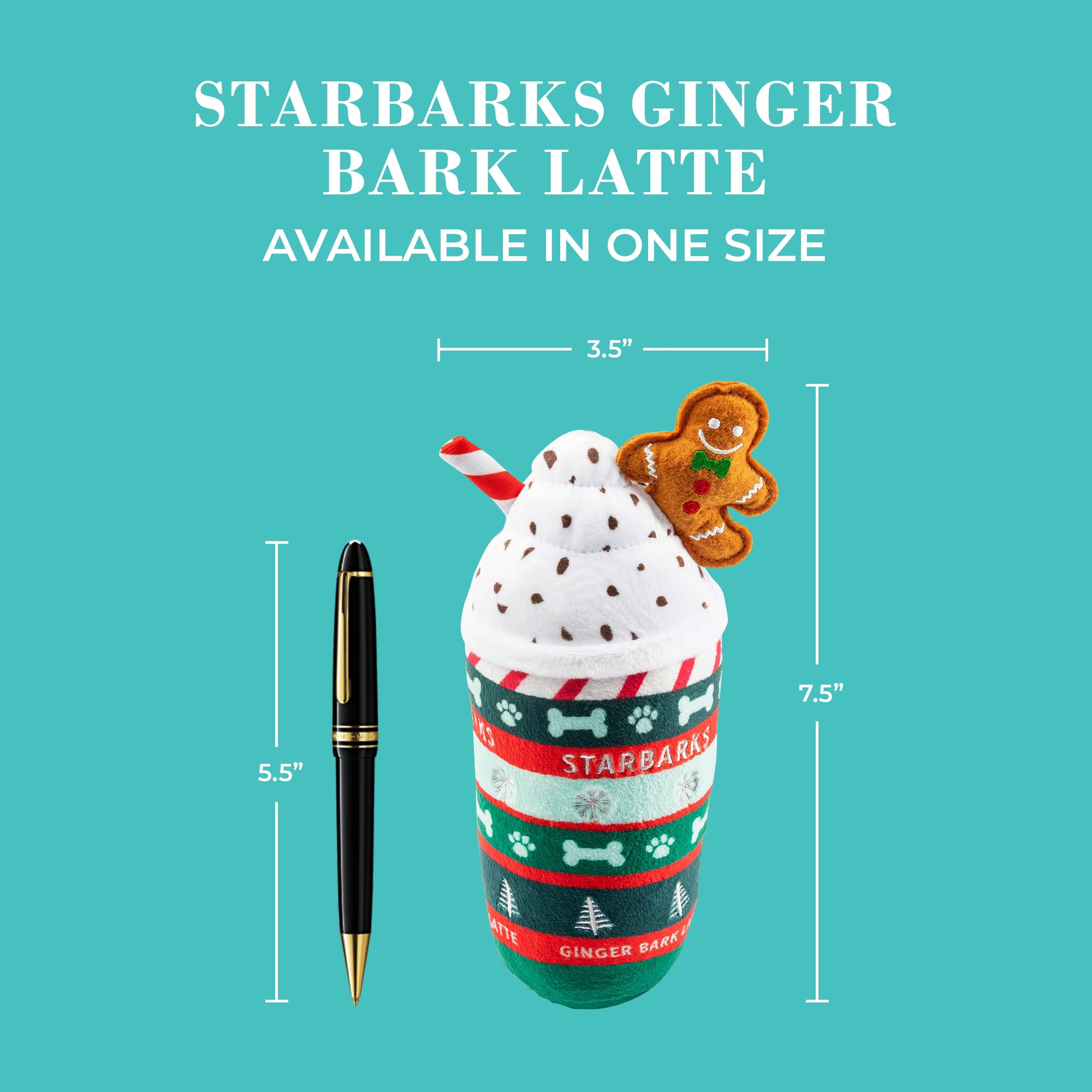 Funny Parody Plush Dog Toy: Treat your furry friend this festive season with our Starbarks Ginger Bark Latte Christmas dog toy. This dog toy features a holiday themed plush exterior with a built-in squeaker hidden inside. It’s a fun, cute interactive dog toy for dog owners who love coffee and Christmas! One Size 7”x3.5"x2".