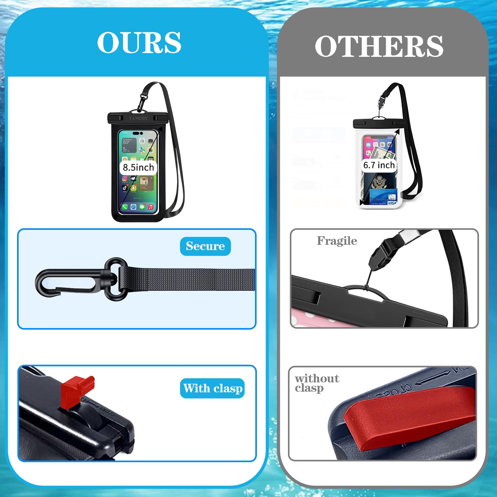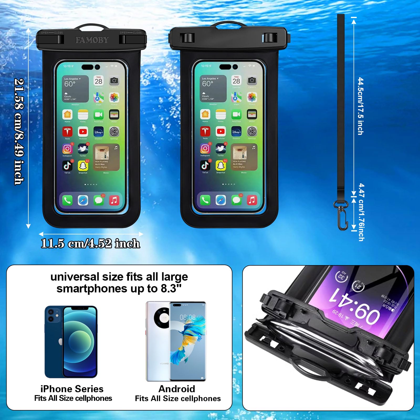 Materials: The Waterproof case is made of durable PC and transparent PVC materials. Super thin 0.3mm material makes touch sensitive, not any delay. IP68 Certified 30 meter underwater. It is easy to touch, Response, Type, Take Photos and Videos sensitive, Not any delay. No Bad Effect Upon Your Skin. Screen Touch Friendly: The waterproof case dry bag fits all smart phones up to 8.7" diagonal size.Clear PVC window allowing you to take photos conveniently even underwater. Capture the underwater world as you see it. Application: The waterproof pouch case is vacation Essentials for Aquatic Sports.it perfect for swimming,beach trip, underwater snorkeling, surfing, boating, skiing,fishing,kayaking,rafting. Capacity: It can hold not only cell phones but also ID, credit cards, cash, and keys.Length x Width: 8.6"x 4.3", Compatible for phone up to 8.7 inches; ideal phone water protector pouch for Apple iPhone,Samsung,and up to 8.7"; Sturdy lanyard on the top for easy carrying, Free your hand and have fun! Test Before Use : First Fill with paper towel in the waterproof phone bag, squeeze air before Sealed; Then Submerge underwater for about 15 minutes. Last Downside the top mount to take out the object, avoid water going into the case. High quality product from Brand "Famoby"!