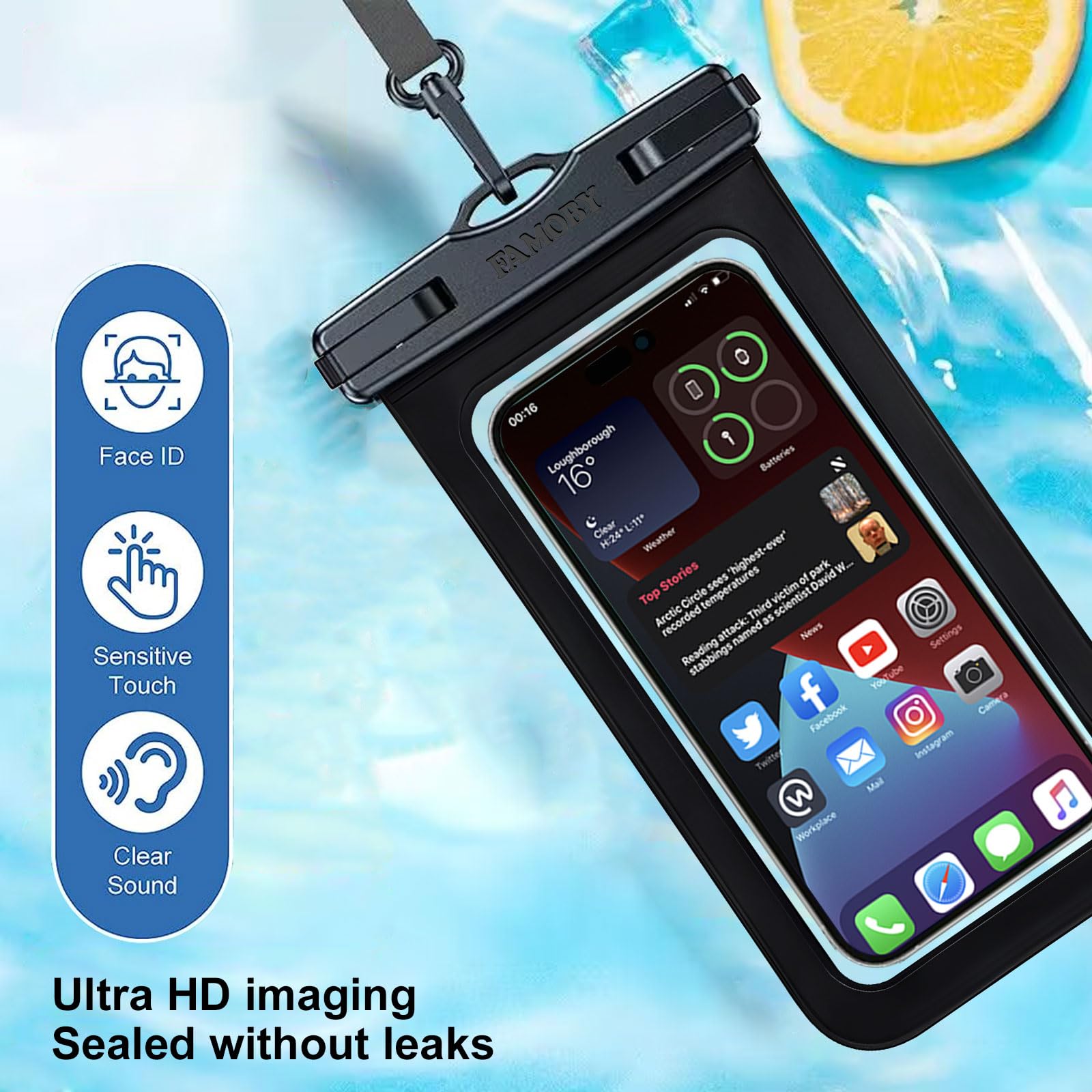 Test Before Use : First Fill with paper towel in the waterproof phone bag, squeeze air before Sealed; Then Submerge underwater for about 15 minutes. Last Downside the top mount to take out the object, avoid water going into the case. High quality product from Brand "Famoby"!
