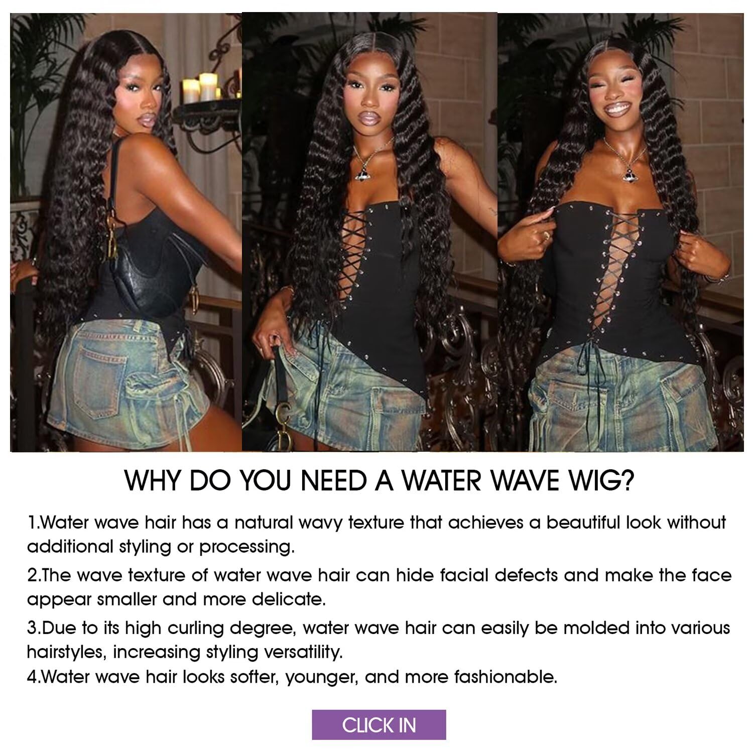 Lemoda Water Wave texture Advantages--1.Water wave hair has a natural wavy texture that achieves a beautiful look without additional styling or processing.2.The wave texture of water wave hair can hide facial defects and make the face appear smaller and more delicate.3.Due to its high curling degree, water wave hair can easily be molded into various hairstyles, increasing styling versatility.4.Water wave hair looks softer, younger, and more fashionable