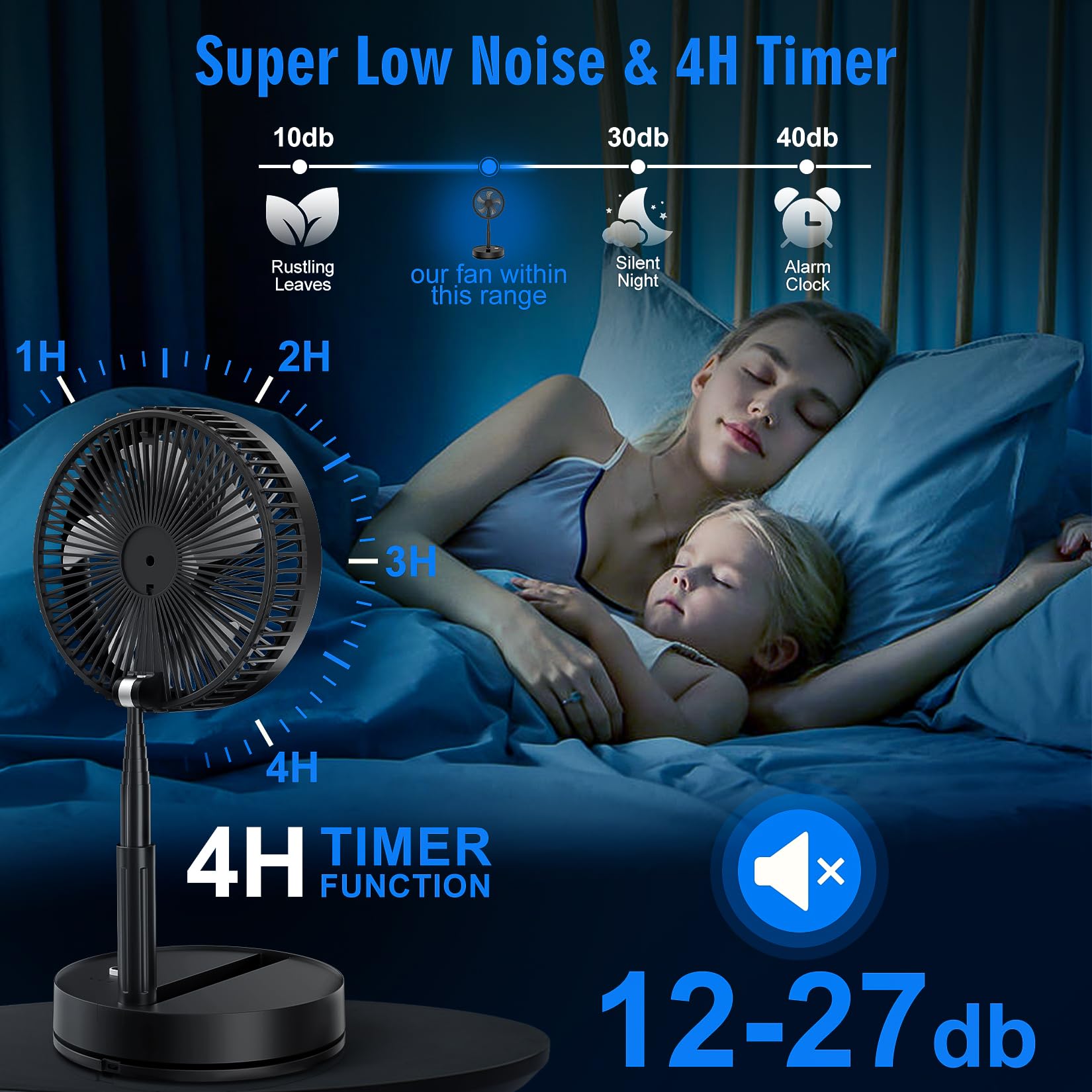 Super Quiet Fan: 4 levels wind modes - breeze wind / soft wind / strong wind / natural wind super silent 12~27db additional sleep mode on remote controller could used as a bedoom bedside fan enjoy a peaceful cooling sleeping.