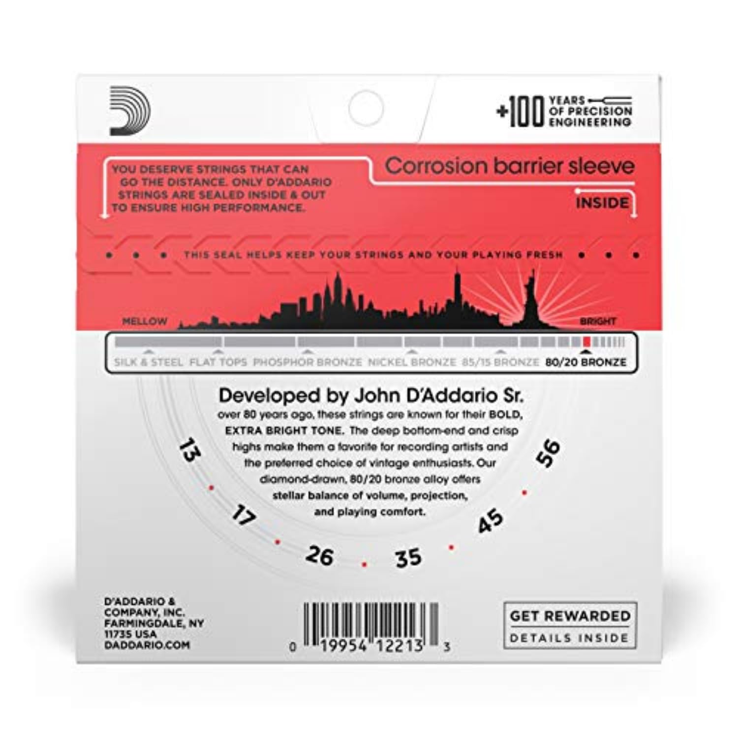 Product Description 80/20 Bronze are our brightest acoustic strings, made to give your guitar an unparalleled shine. These bold sounding strings were developed by John D'Addario Sr. and guitar maker John D'Angelico in the 1930s, and have been beloved for their sparkling, trebly tone ever since. Made with a high carbon steel core and 80/20 Bronze wrap wire, 80/20 acoustic strings offer remarkable depth, along with rich, bright harmonics, and powerful projection. 13-56 Medium gauge strings provides maximum volume and projection, with more tension and resistance. From the Manufacturer D'Addario's heaviest 80/20 Bronze gauge, EJ12s offer heavier tension resulting in a bolder, more resonant acoustic tone with higher resistance for heavy strumming and flat-picking. 80/20 Bronze, commonly referred to as brass, is the original acoustic string alloy selected by John D'Addario Sr. and John D'Angelico in the 1930s. 80/20 Bronze strings are popular for recording due to their crisp, deep and projecting tone and appeal to many traditionalists and vintage enthusiasts for their historical significance. All D'Addario acoustic strings are wound on a hexagonally shaped, high carbon steel core, resulting in long lasting, bright sounding tone with excellent intonation. D'Addario, the world's largest manufacturer of musical instrument strings, is known as The Players Choice with a reputation for unsurpassed quality and consistency. D'Addario's innovative packaging reduces waste and provides protection from corrosion. All D'Addario strings are manufactured in the U.S.A. using proprietary, digitally controlled, state-of-the-art machinery for unmatched performance, set after set.