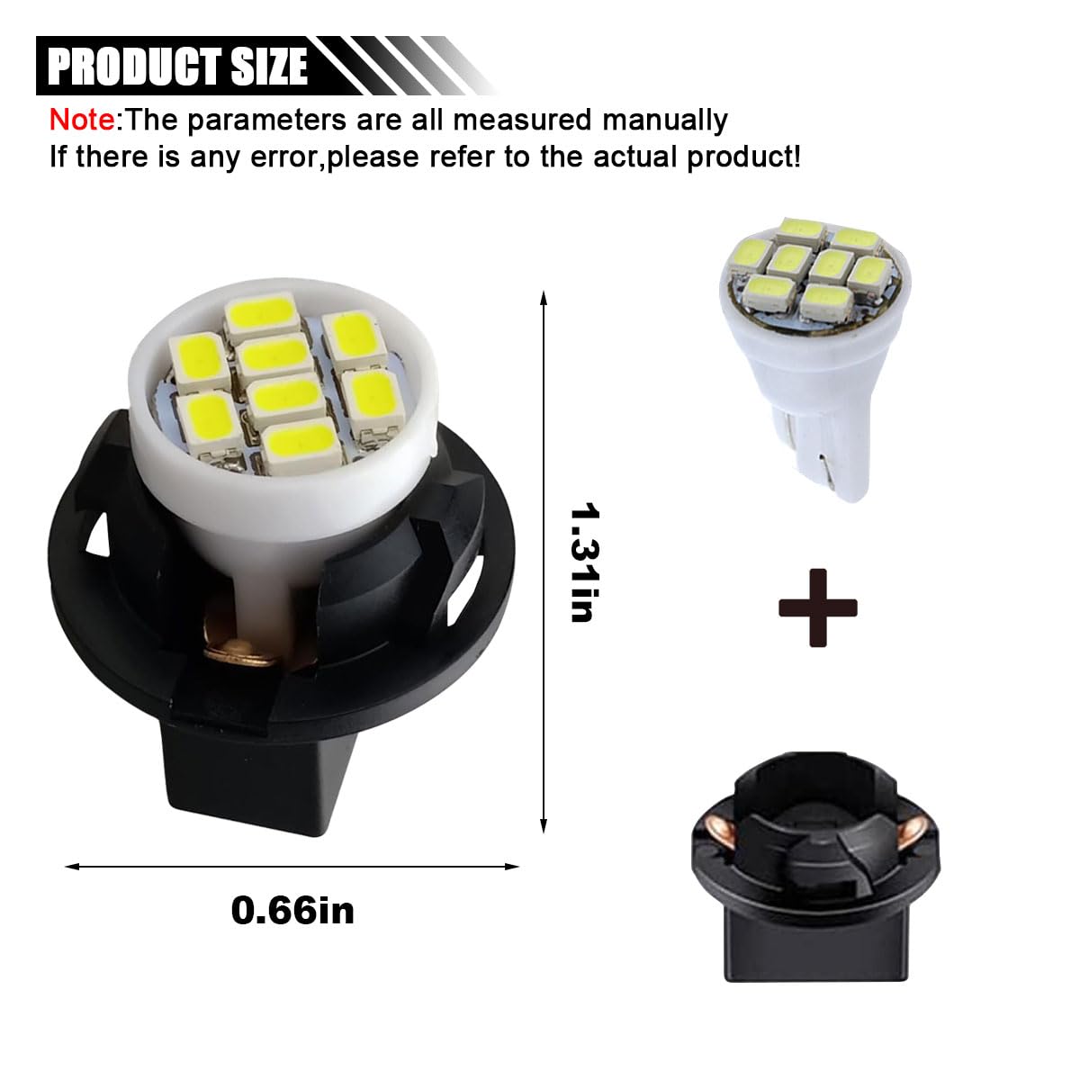 【Specifications】: Operates at 12V with a power of 2w/pcs, emitting 100lm/pcs. Bulb size measuring 0.68 x 0.42 inches, black base socket measuring 0.66 x 0.63 inches. Low power consumption, service life of 30,000~50,000 hours.