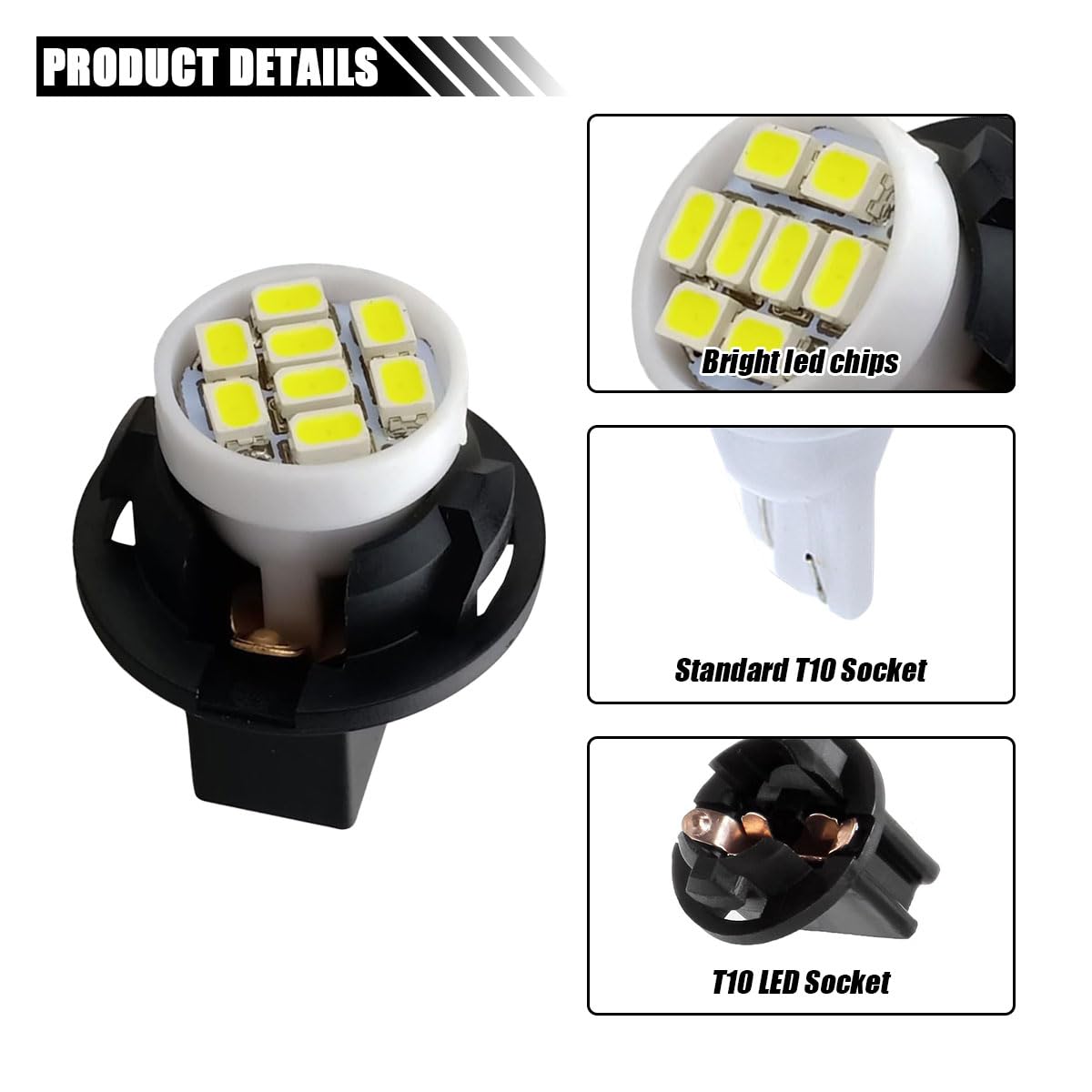 【Replacement】: Replaceable bulbs for the following models: T10, 147, 152, 158, 159, 161, 168, 175, 184, 192, 193, 194, 2825, W5W.