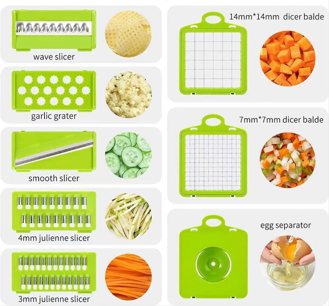 Elevate your kitchen with ALL IN ONE PRO SERIES OF VEGETBLE CHOPPER from a well-known brand AIGLE nova , blending ergonomical design and function. This versatile tool includes 6 food grade stainless steel blades for chopping, slicing, dicing, and grating and a peeler making meal prep 10x faster and easy. Its ergonomic design, sleek aesthetic, and durable 1.2L container ensure comfort and efficiency in any modern kitchen. Made from high-quality, BPA-free materials, it’s built for health-conscious families seeking premium quality. Simplify your cooking routine, save time, and enjoy professional-level results with this stylish, efficient kitchen essential that complements your home’s sophisticated design. AIGLE nova —where style meets practicality. Effortlessly prepare fresh and healthy meals with this versatile vegetable chopper and container set. The chopper's sharp blades make quick work of slicing, dicing, and shredding a variety of fruits and veggies, while the included container catches the perfectly cut pieces. With multiple interchangeable blades, you can customize the cut size to suit your recipe's needs. The compact design allows for easy storage, and the container doubles as a serving bowl, minimizing mess and cleanup. Crafted from durable materials, this chopper set is built to withstand frequent use in your kitchen. Elevate your cooking game and enjoy the convenience of homemade salads, stir-fries, and more with this essential kitchen tool.