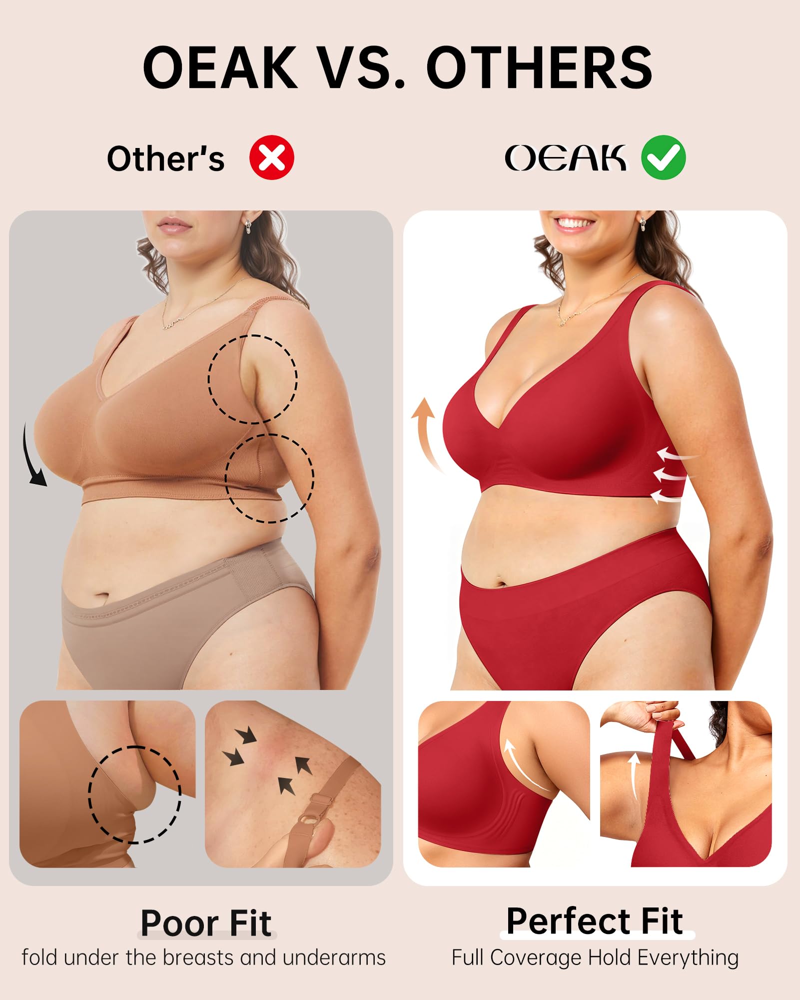 Full Support Bras - These no-wire bras feature a "W-shaped" and innovative 3D supportive technology formed by liquid jelly band, providing full support for your breasts and creating a full, natural-looking chest without the discomfort of a traditional underwire bra. The widened side of the bras with jelly band can effectively conceal excess fat.
