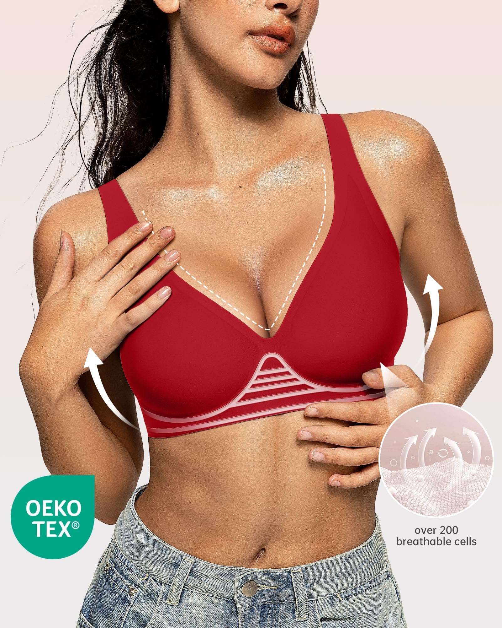 Ultra Soft and Comfortable Bras - These deep V bras with semi-fixed pads are made from high-quality fabric with a delicate texture, super breathable and gentle on the skin, providing a feather-light feeling with zero pressure. The highly stretchy design fits perfectly under your chest curve, effectively preventing the bra from slipping when lift your hands. Each semi-fixed pad has over 200 breathable holes, keeping you cool and comfortable for 24 hours.