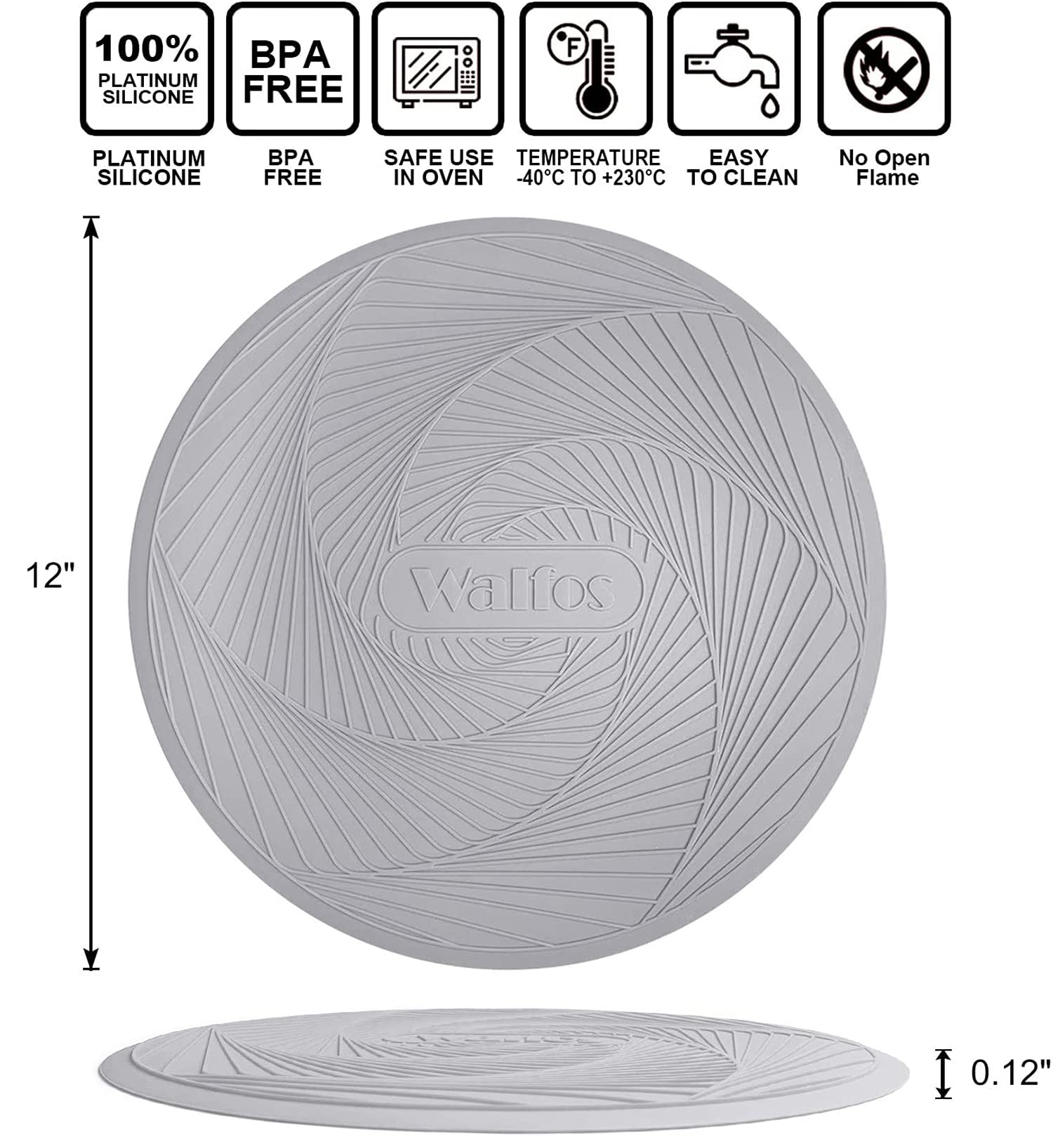 MULTIPURPOSE SILICONE MAT: Walfos microwave mat silicone round perfect for using as microwave splatter cover, drying mat, utensil rest, place mat, jar opener, hot pad and trivet or pot grabber etc. Package Includes: One round microwave mat (12 inch)