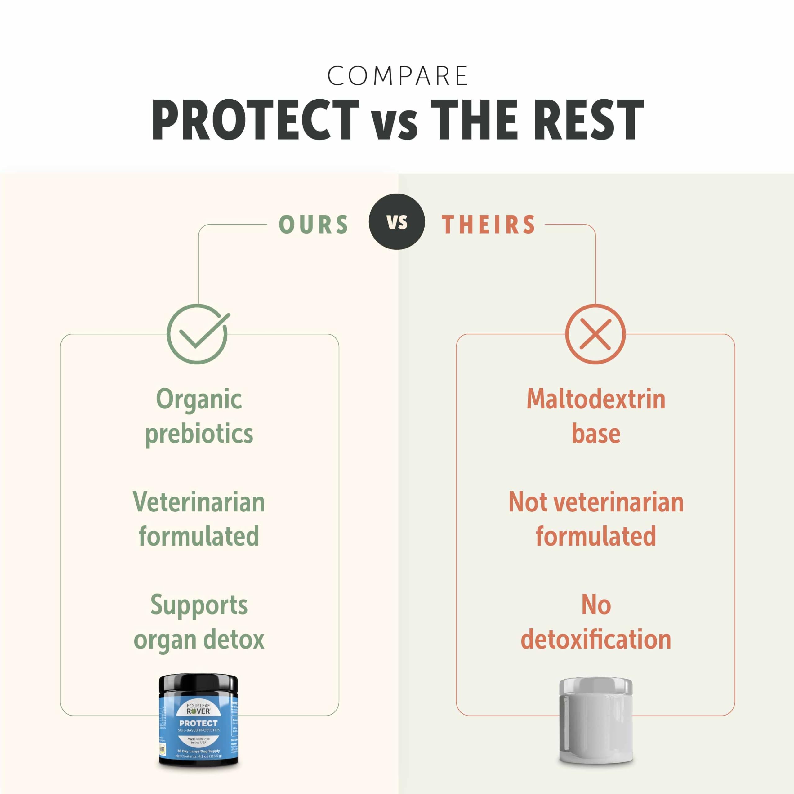VETERINARIAN FORMULATED FOR GUT HEALTH: These premium dog probiotics are veterinarian formulated to ensure top-notch gut support. Protect contains soil-based probiotics for a happy tummy!