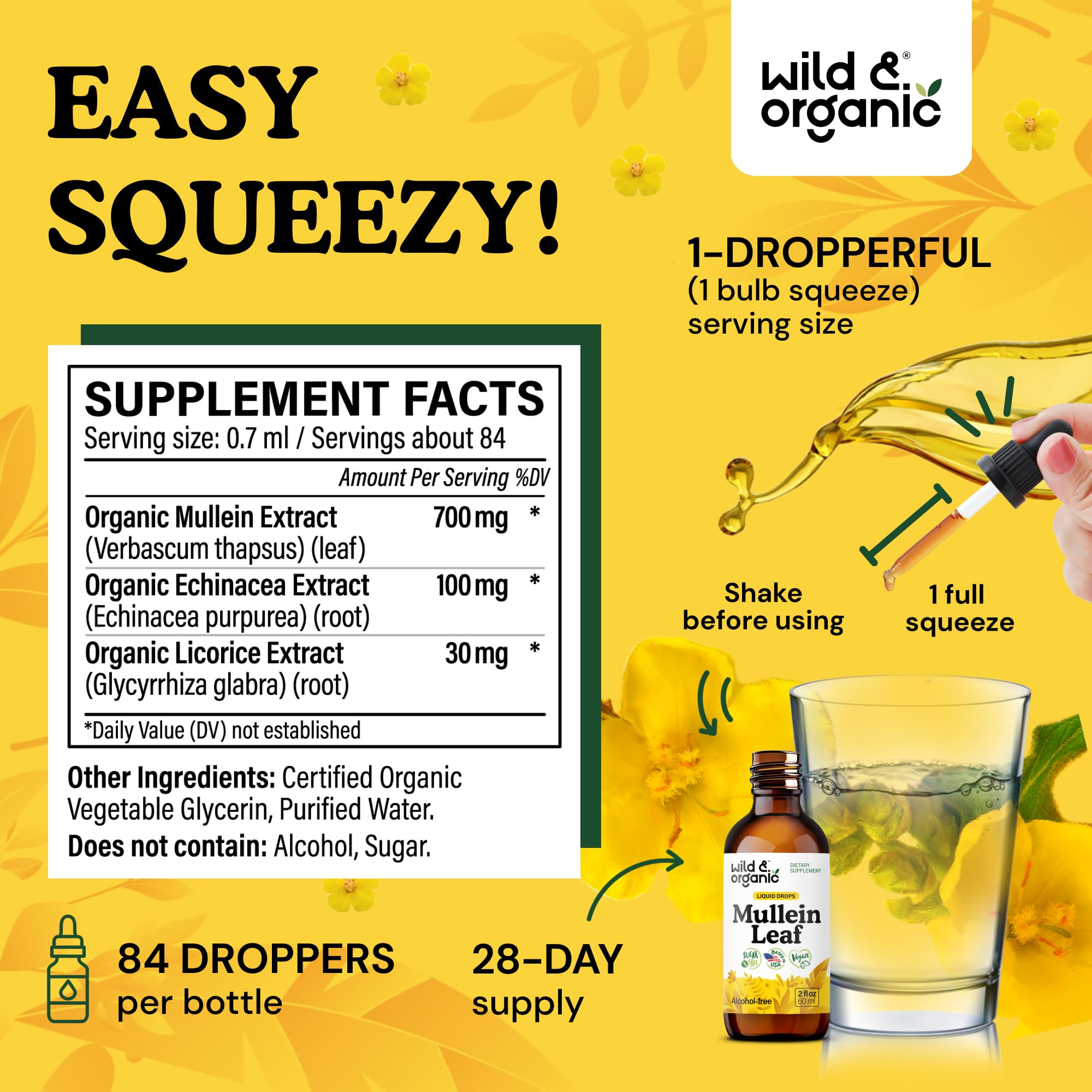 28-Day Supply: Each 2 fl. oz. bottle of Wild & Organic mullein leaf drops contains 84 servings per bottle, providing a 28-day supply when taken three times per day.