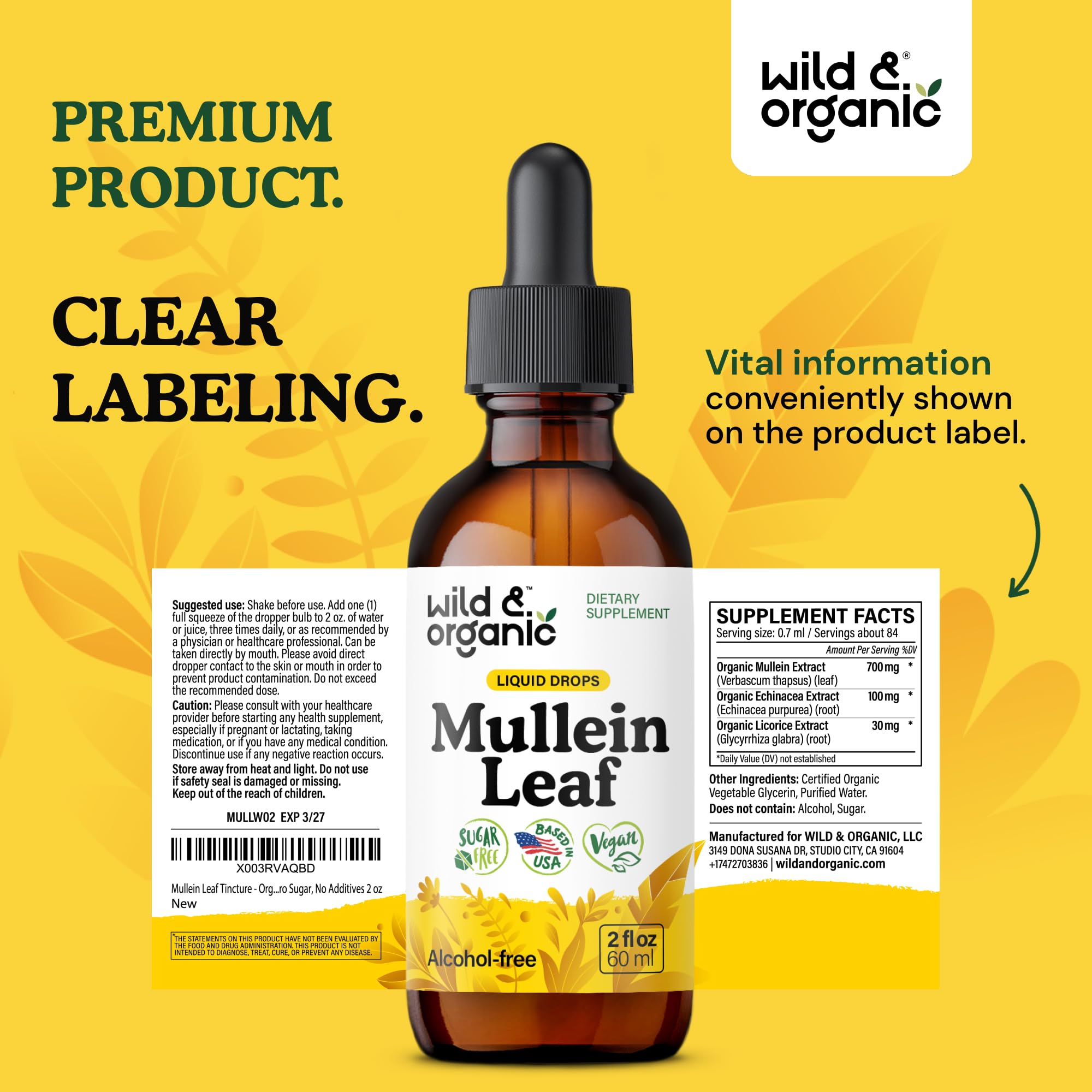 Lung Support: Each serving of Wild & Organic mullein tincture contains 700 mg of mullein leaf extract for lungs, 100 mg of echinacea, and 30 mg of licorice root extract to support lung detox.