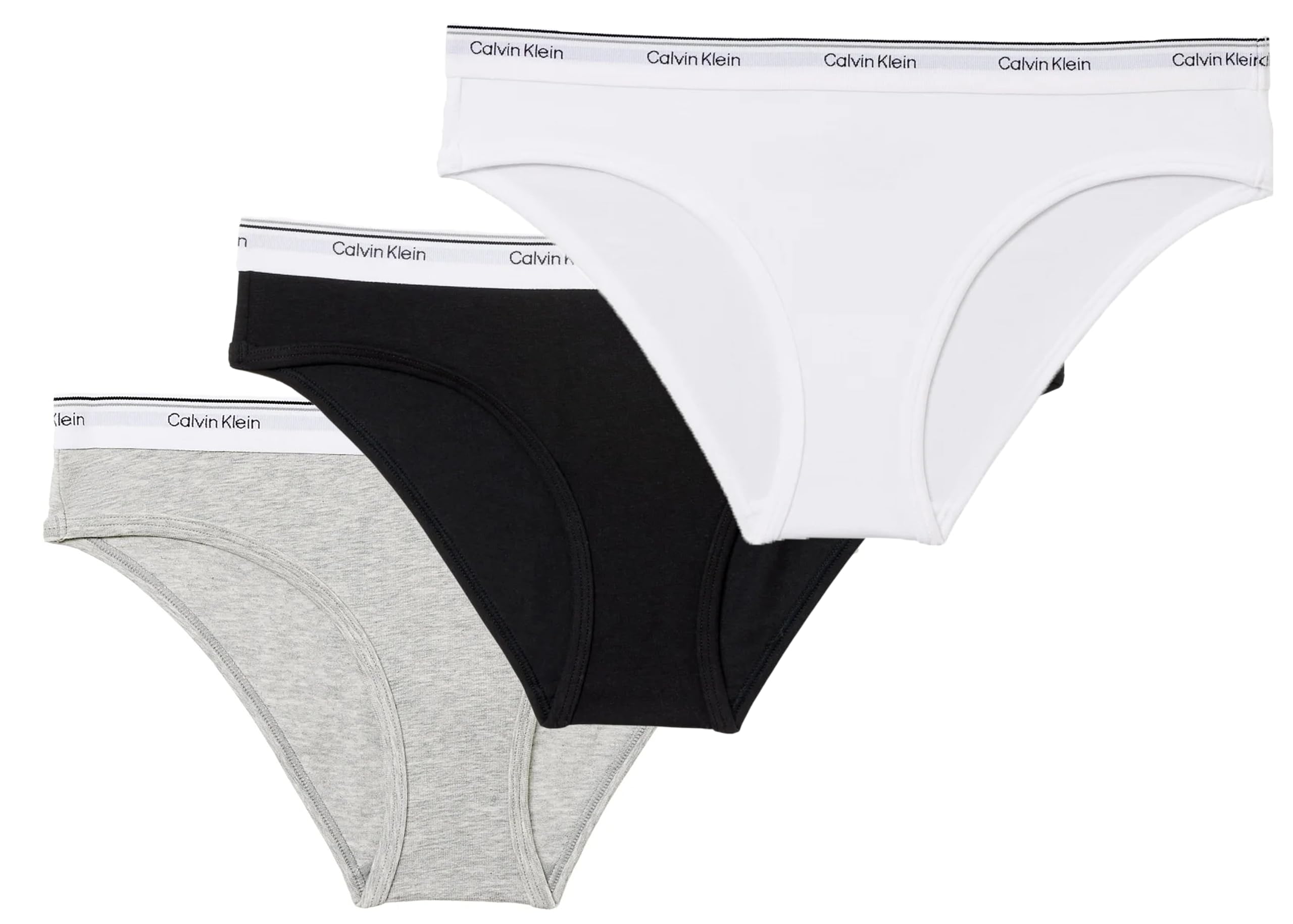 Classic Bikini Underwear 3-Pack Essential Comfort: This Calvin Klein bikini set includes three pairs Black, Snow and Heather Gray of premium women's underwear with a signature logo waistband. Made from soft cotton-modal blend for everyday comfort.