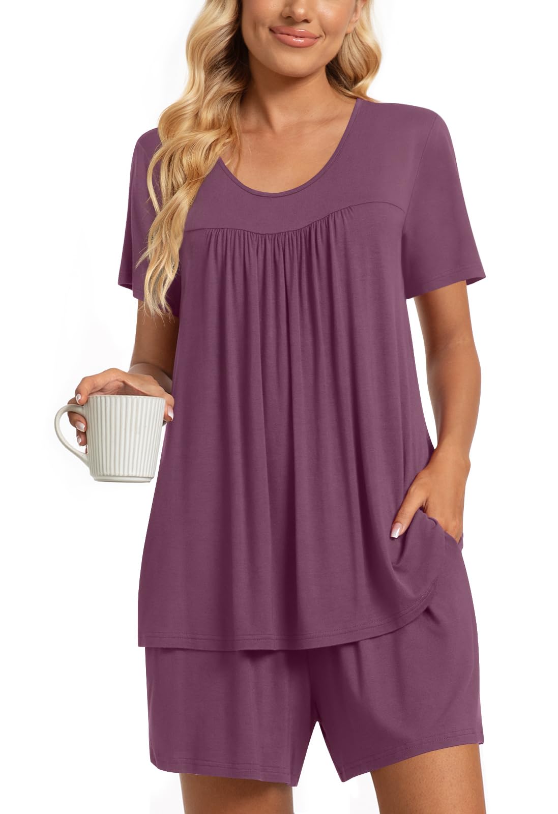 Fashion-Simple Design: Cute two piece outfits, sleeveless tops, soft nightwear, scoop neck and front pleated detailed design. Elastic waistband shorts, casual loose comfy, graceful and easeful