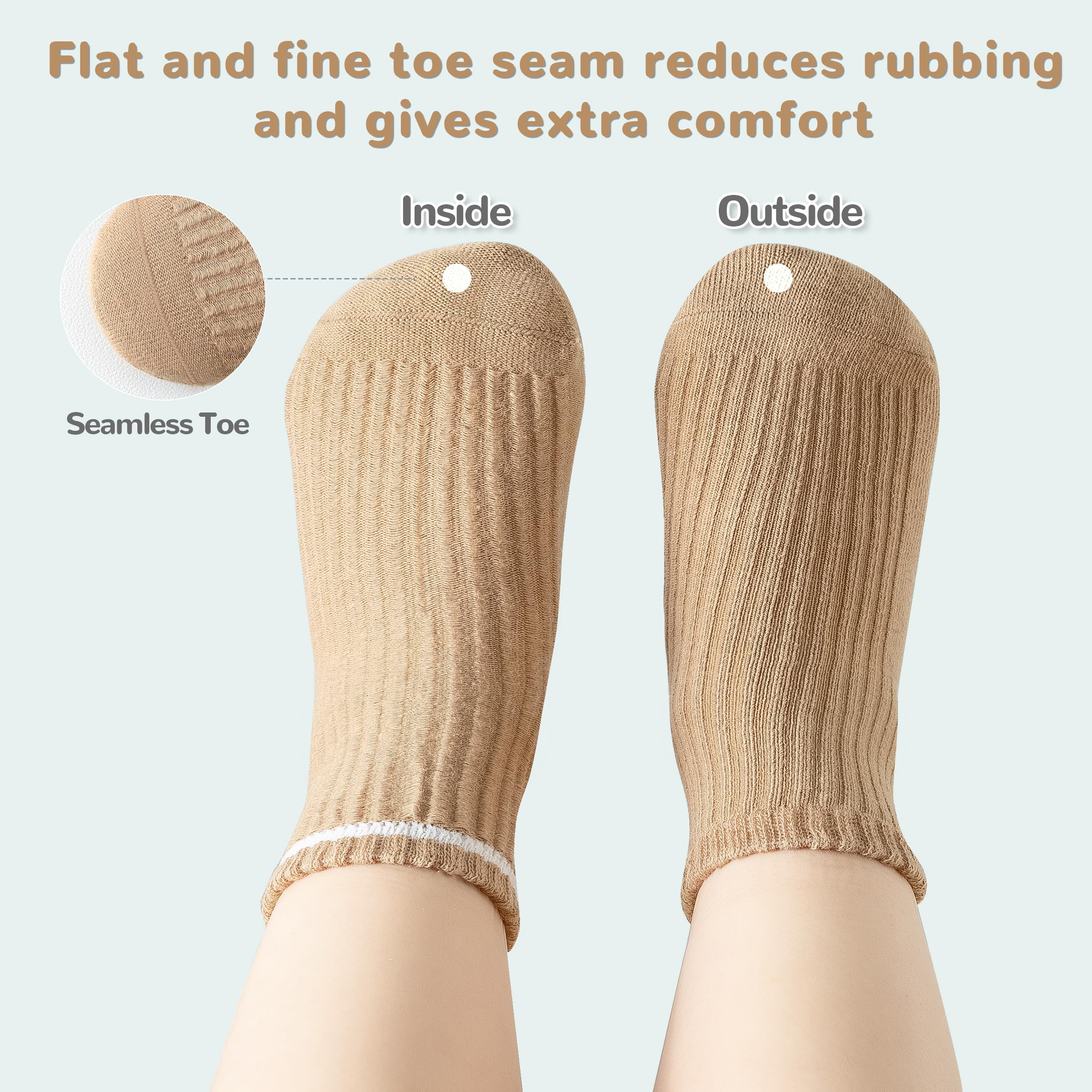 Our toddler crew socks are use advanced boneless seams at the toe, small and flat bones without friction, more comfortable. Humanized design with no extra thread on the back side prevent the baby from getting hooked and damaging the soft skin during the wearing process.