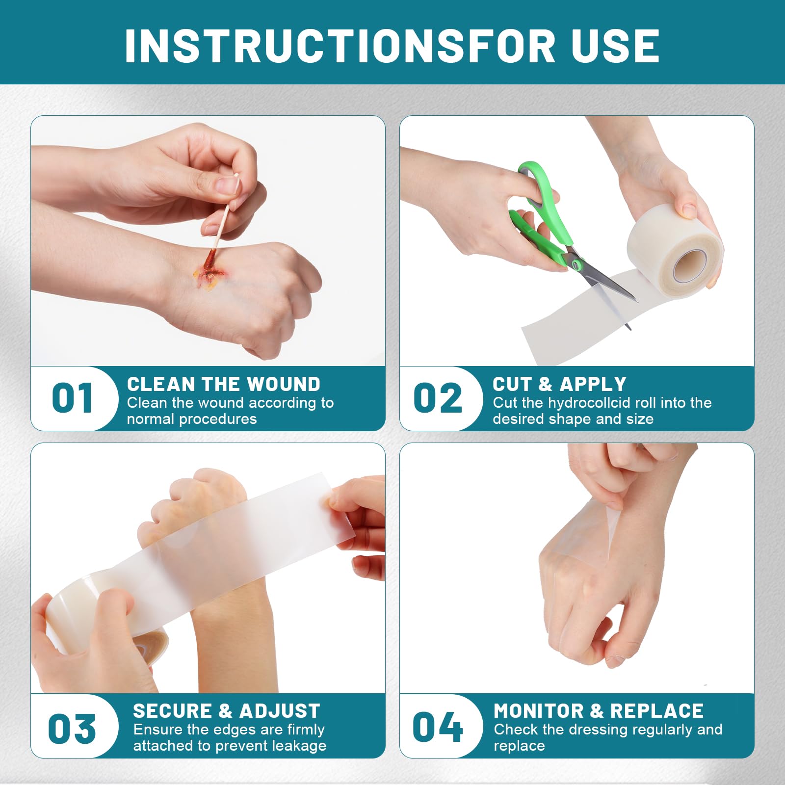 Easy To Use: The cut size of the hydrocolloid dressing should be 2cm larger than the wound edge, the self-adhesive backing eliminates the need for additional tape, and the gentle adhesive is easy to remove to avoid secondary trauma. The transparent hydrocolloid roll allows you to check the dressing regularly and change it when wet, dirty or necessary.