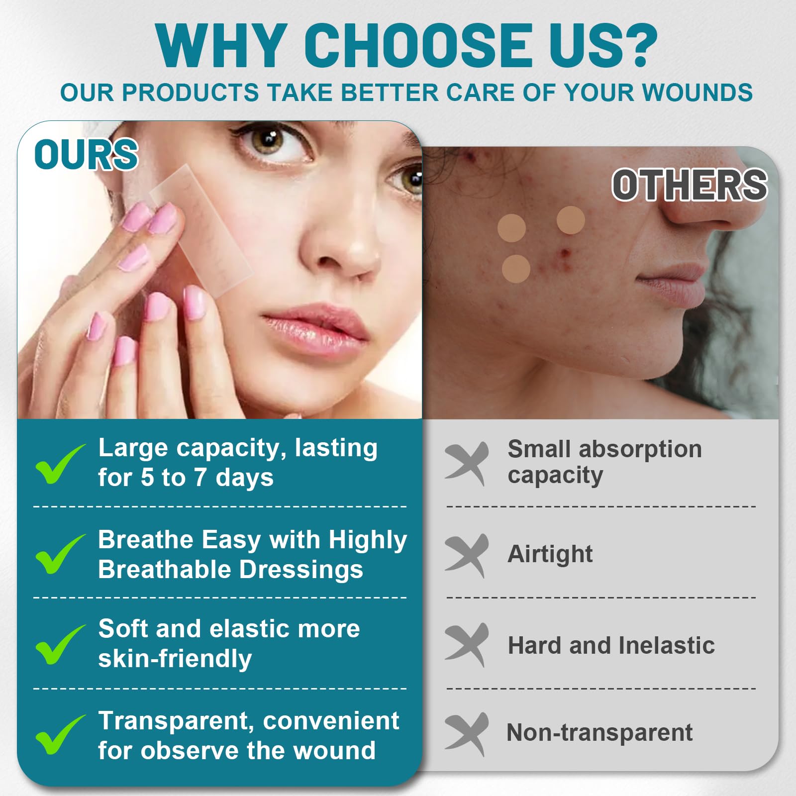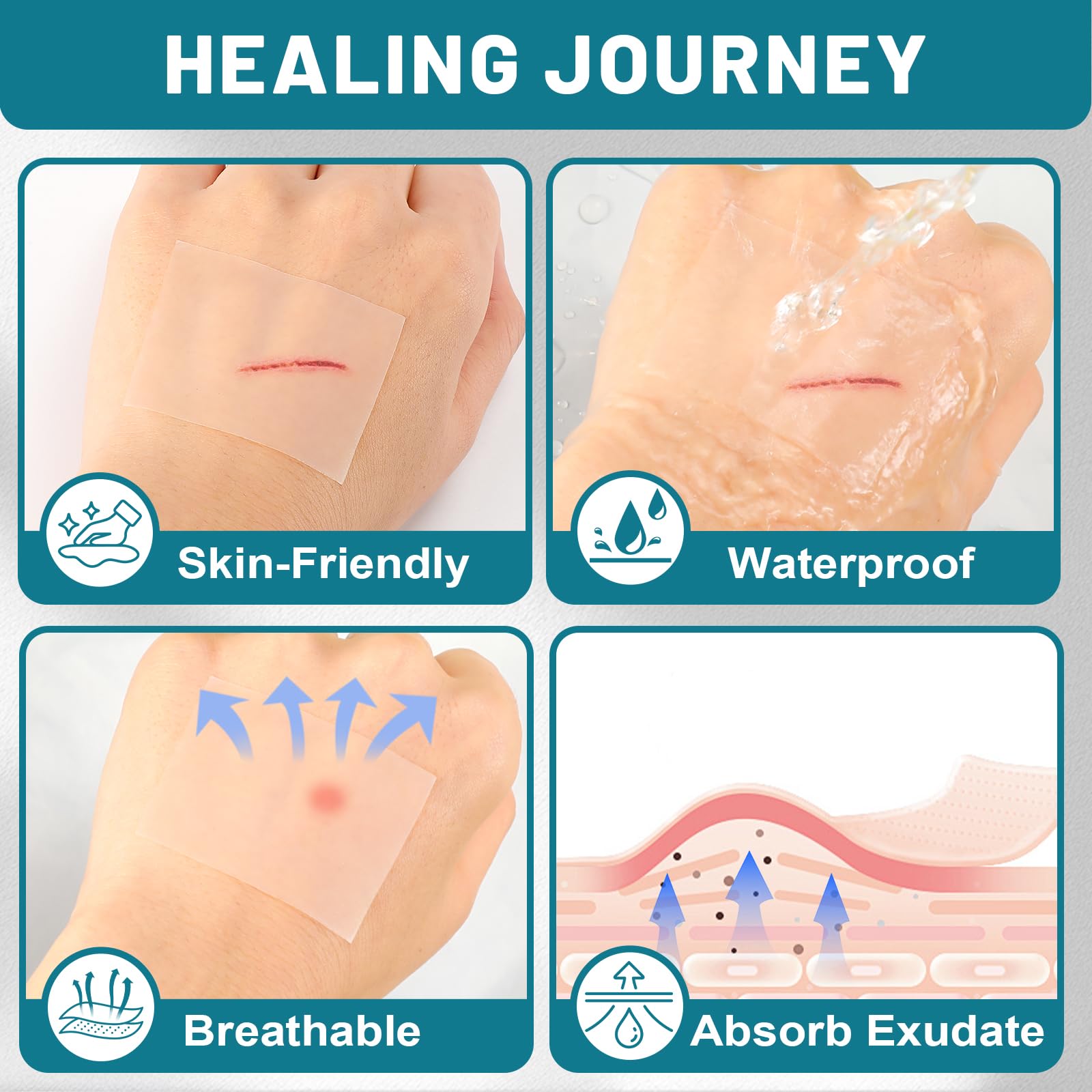 Promote Wound Healing: This transparent hydrocolloid bandage not only provides a moist healing environment to minimize wound infection, but also absorb oils and exudates for 5-7 days without replacement. Breathable dressing promotes rapid healing and minimizes scarring.