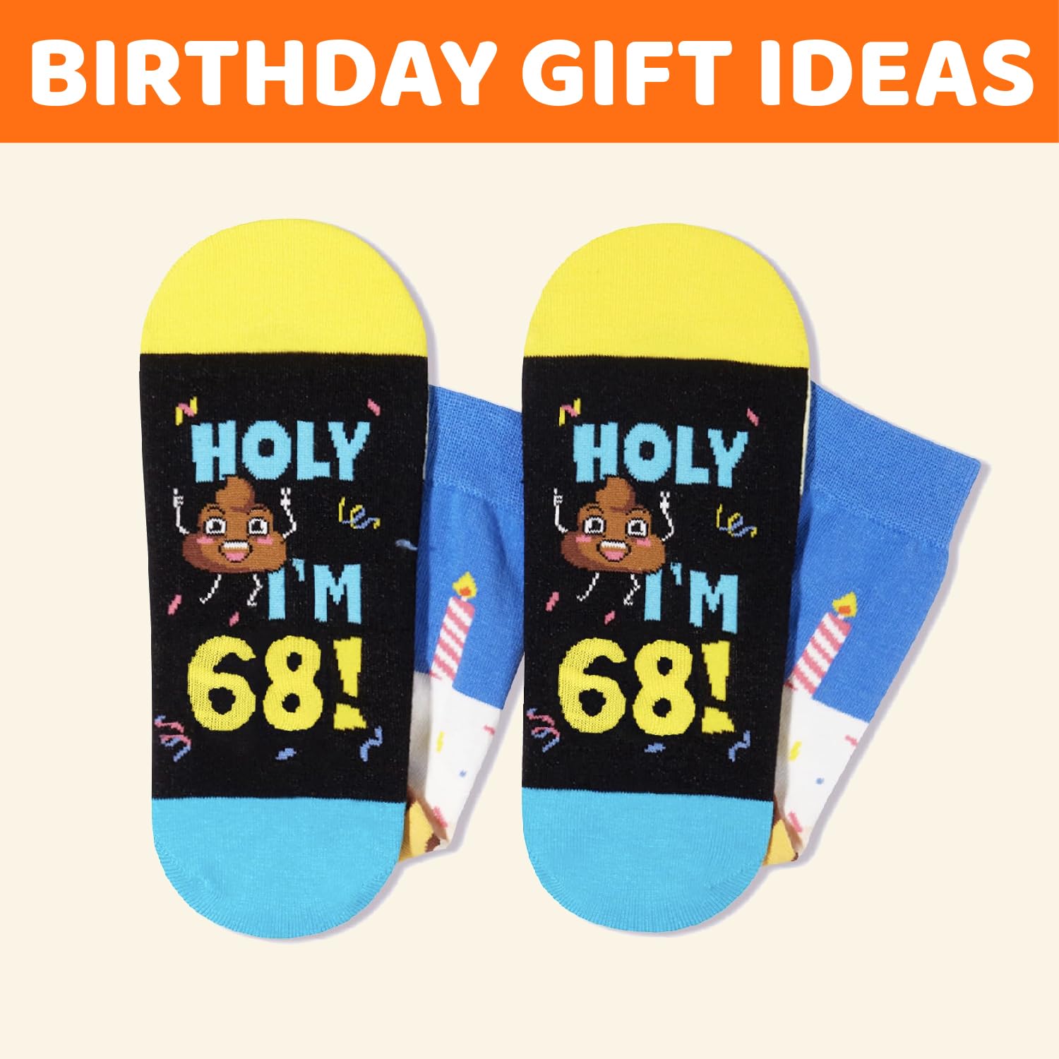 68TH BIRTHDAY GIFT IDEAS: These socks feature a cake and candle design on top, while the bottom is sewn with a fun message: "HOLY, I'M 68!". They are suitable for any holiday gifts, such as Birthday gifts, Christmas gifts, or White Elephant gifts.
