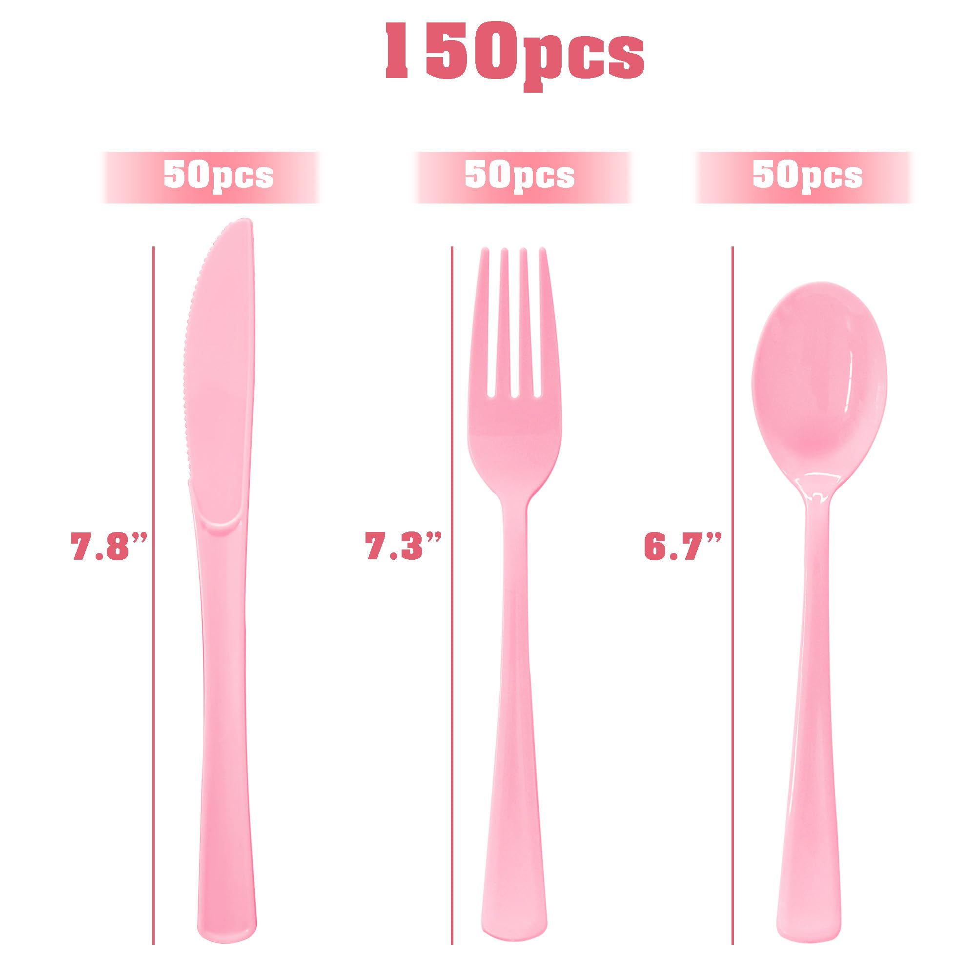 【Cost-Effective Pink Silverware Set】: This pink disposable silverware includes 50 pink forks, 50 pink spoons and 50 pink knives, total 150 pink plastic cutlery. The set is versatile and affordable, and in addition to meeting everyday household, party or business uses, it can also be used as a beautiful gift option for more than one person at the same meal.