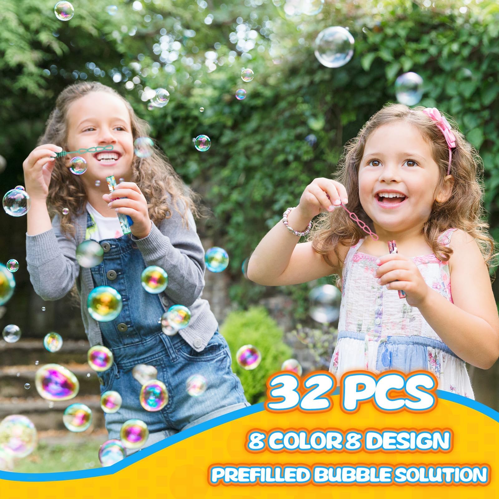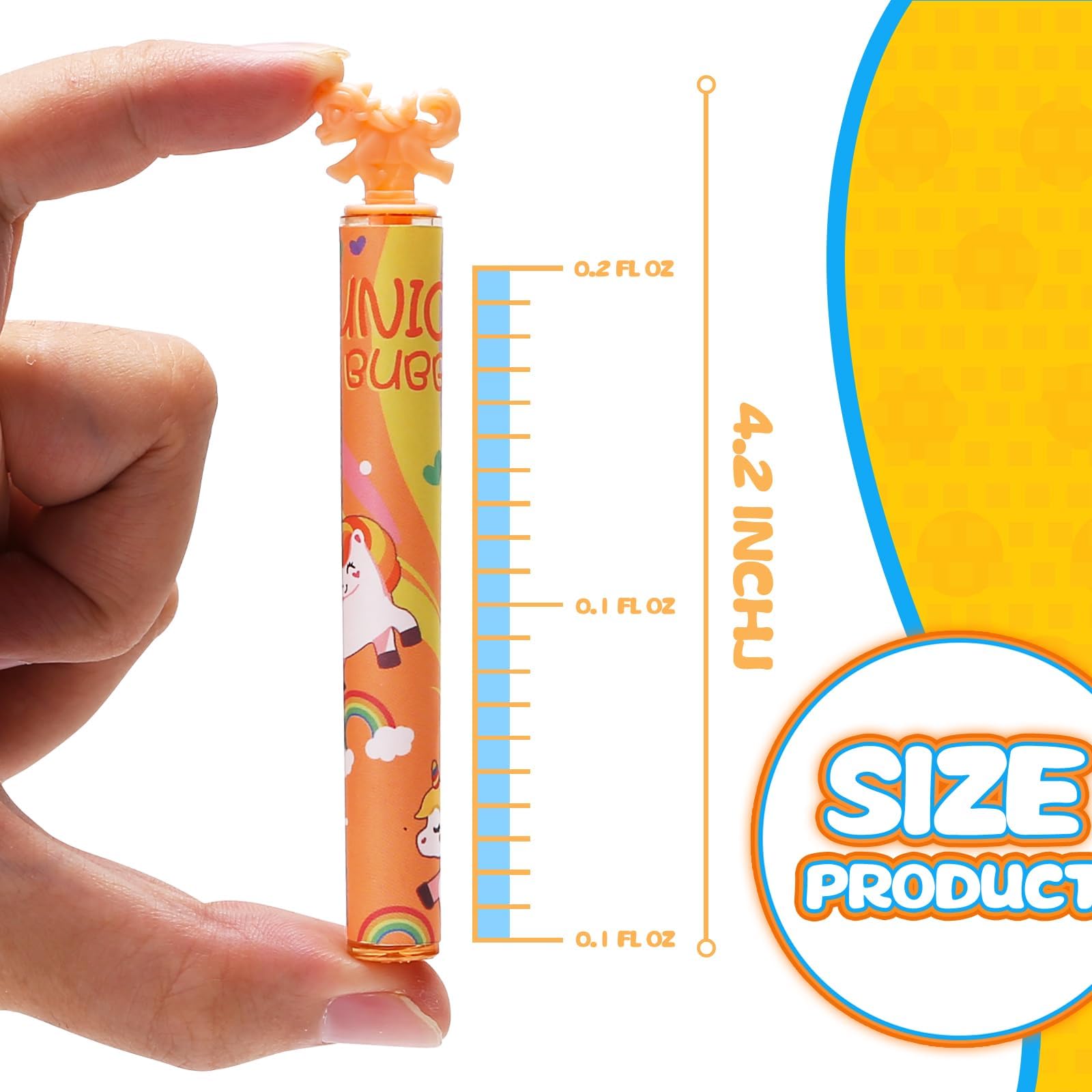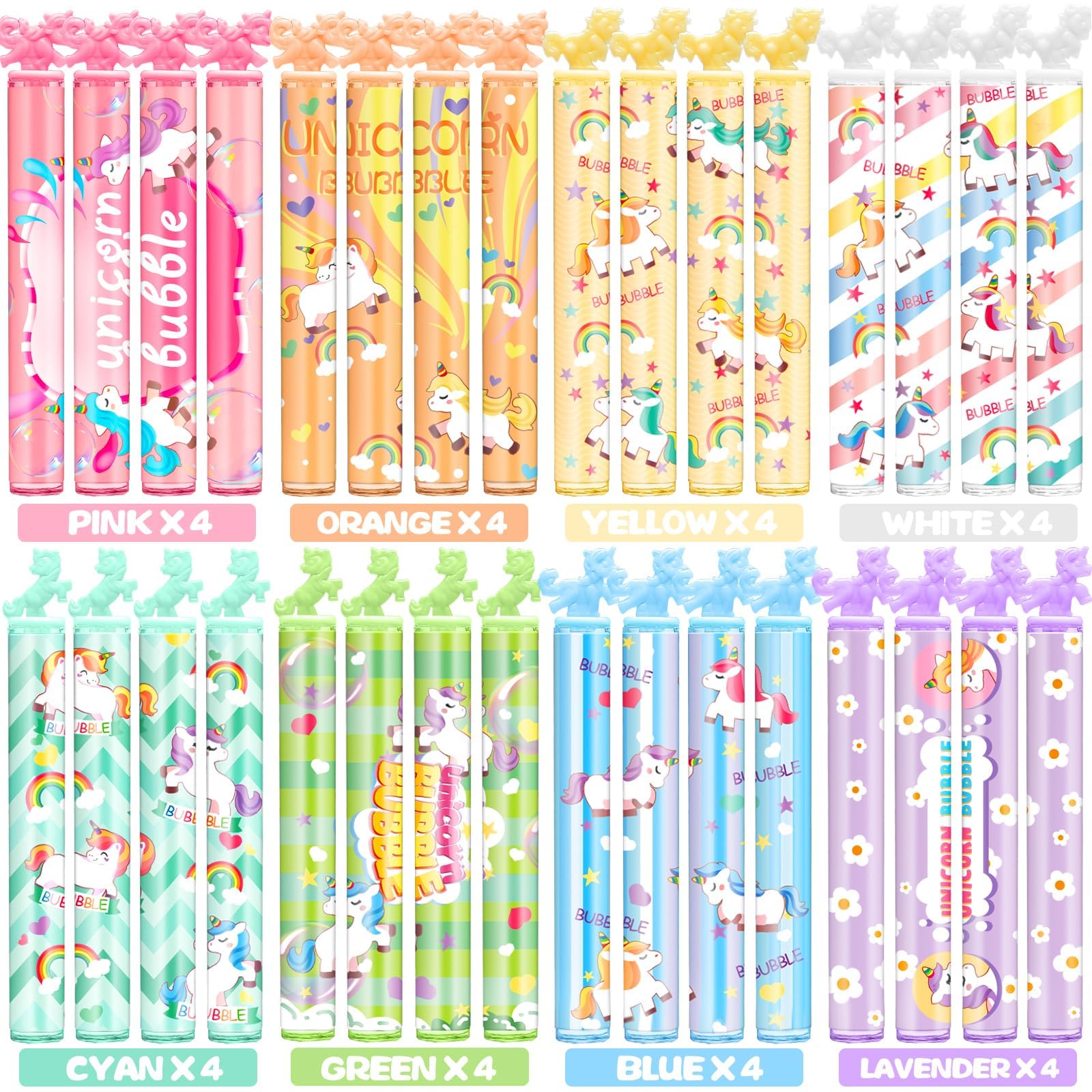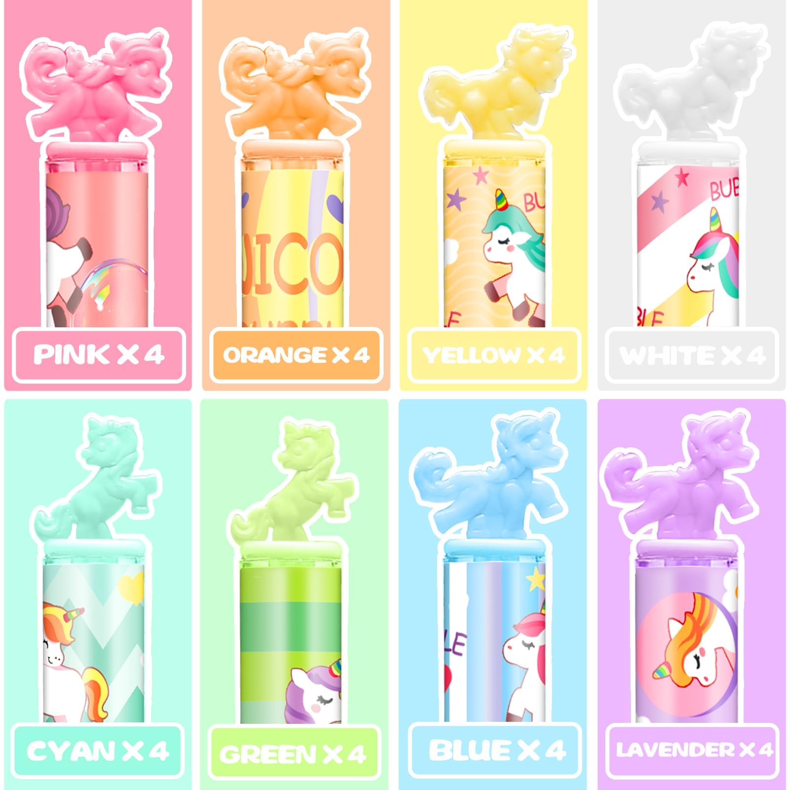 32 Pack bubble bulk With stickers, 8 different pastel unicorn horse design bubble wands. Each mini stick is 4.2 inches high(0.16 Fl Oz), small size for goody bag filler, convenient little kids to carry!