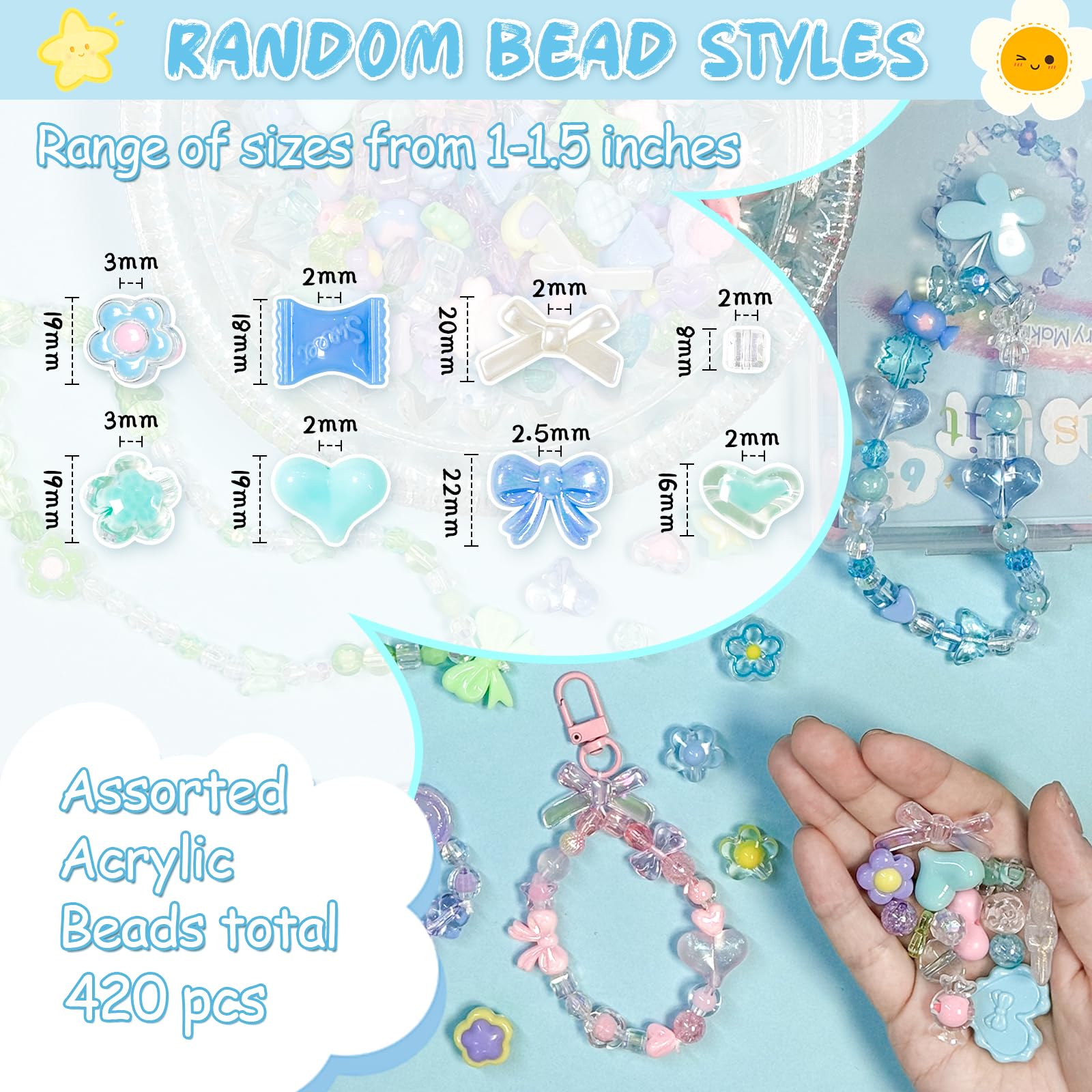 Everythings You Need is Included: This beads kit includes 420-450 pieces acrylic beads in 8 eye-catching hues (red, orange, yellow, green, blue, purple, pink, and pastel pink) and 12+ playful shapes like flowers, stars, hearts, rabbits, bears, pearls, butterflies, and candies. Includes 1 bundle of elastic rope, 1 bundle of nylon string and 4 metal clasps/hooks – everything needed to immediately begin creating bracelets, necklaces, earrings, or decorative items. No extra supplies required!