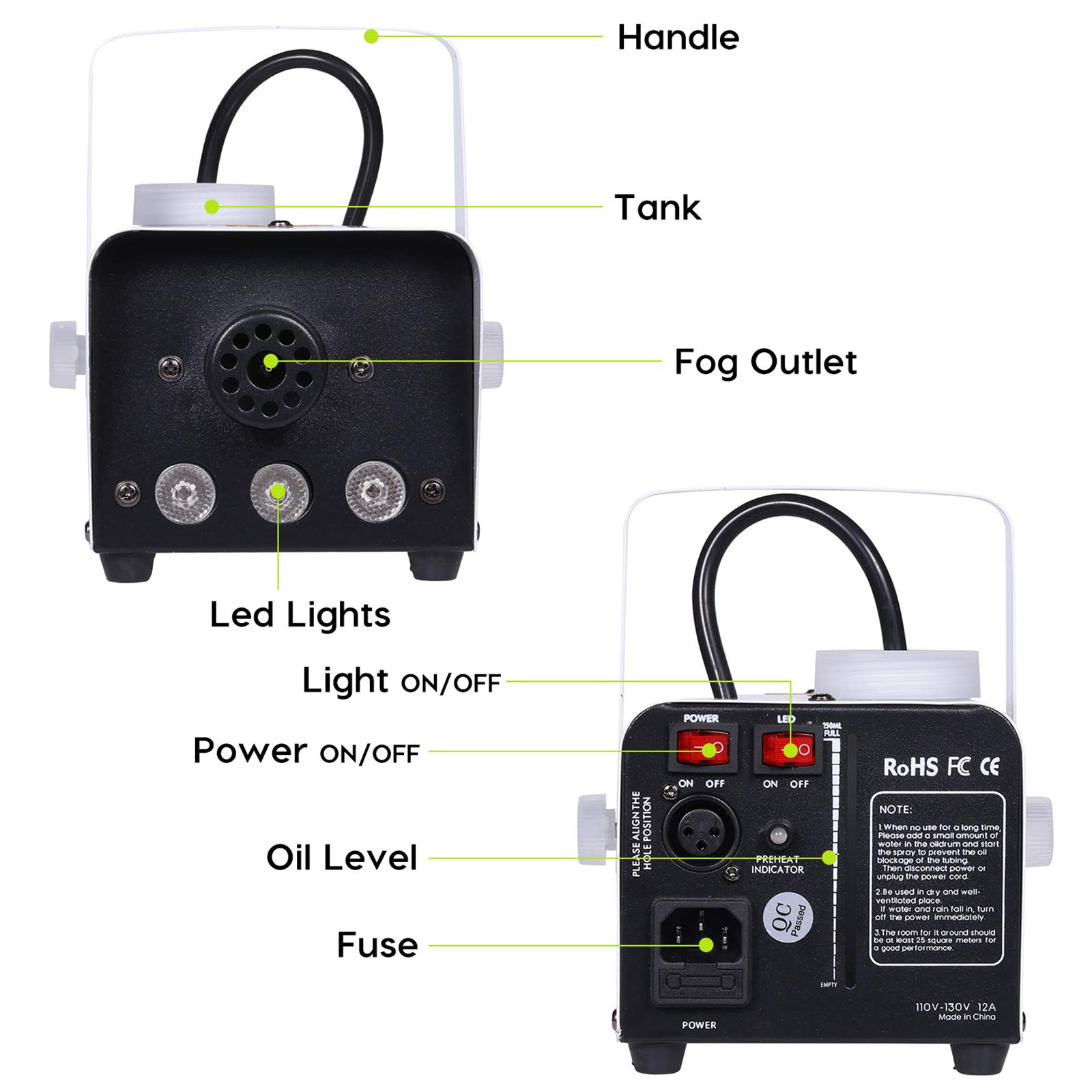 Compact and Portable Fog Machine: Constructed from aluminum and iron to enhance heat dissipation, ensuring durability and a long lifespan. The fog machine holds FCC, CE, and RoHS certifications, guaranteeing safety.