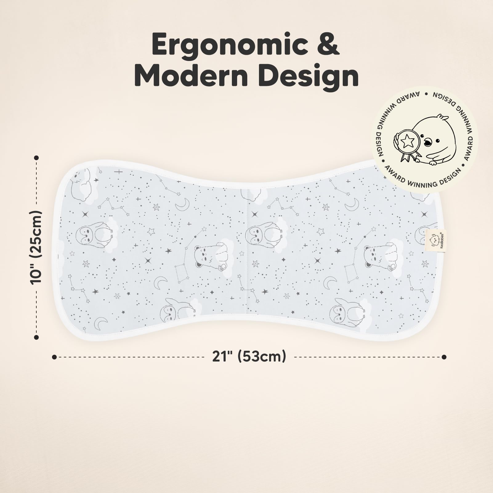 The Figure-8 Full Shoulder Coverage - Our organic baby burp clothes for baby girls and baby boys, sized at 21" x 10", are wide enough to cover your shoulders. The unique figure-8 design prevents the burp rags from slipping.