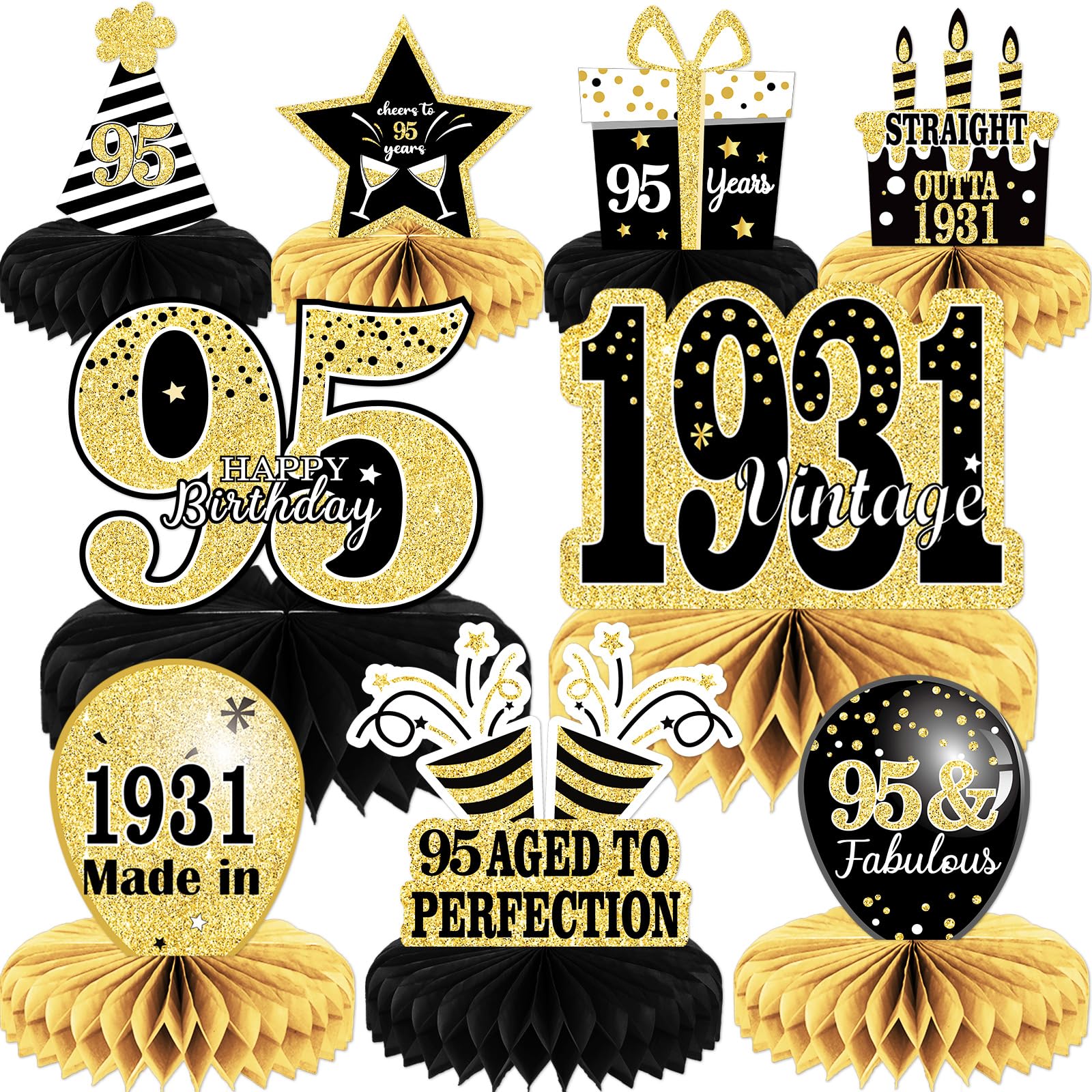 Package:5 pieces 12 inch black latex balloon printed with the words "95 Happy Birthday",5 pieces 12 inch gold latex balloon printed with the words"95 Happy Birthday",5 piece 12 inch gold confetti balloons printed with the words"95 Happy Birthday",very suitable for women men 95th birthday party decorations