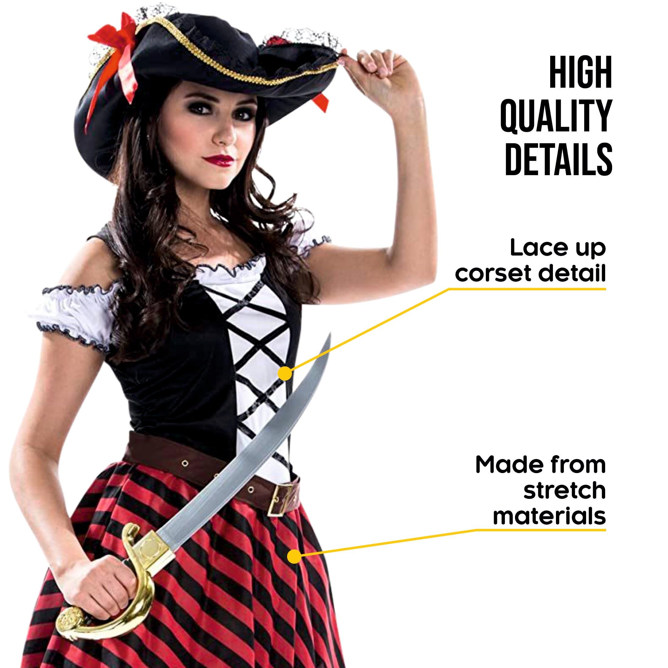 Available in 5 inclusive sizes: Our womens pirate costume is designed for the perfect fit and comes in Small, Medium, Large, X-Large, and XX-Large. Refer to the size guide to find your ideal match for a confident, comfortable wear.