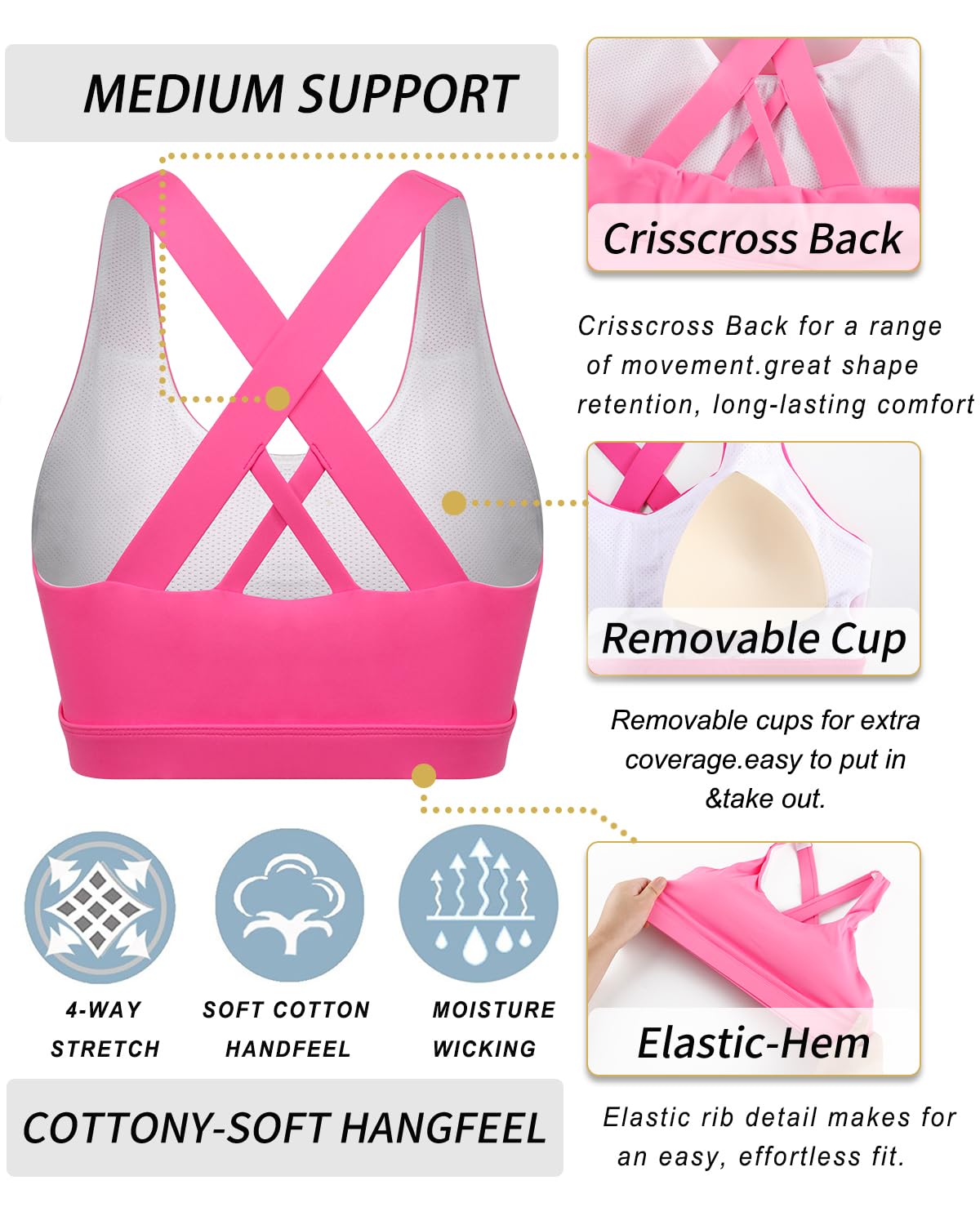 front closure with expansion-proof hook: ready in a fastener, this revolutionary bra with front closure is made of our soft and powerful double-layered fabric to give you comfortable support and a natural shape. Designed to offer full coverage and lift for high support. Elastic-fit yoga and gym sports bra with removable ear pads for a comfortable fit, with a material similar to cotton, soft and comfortable to wear.