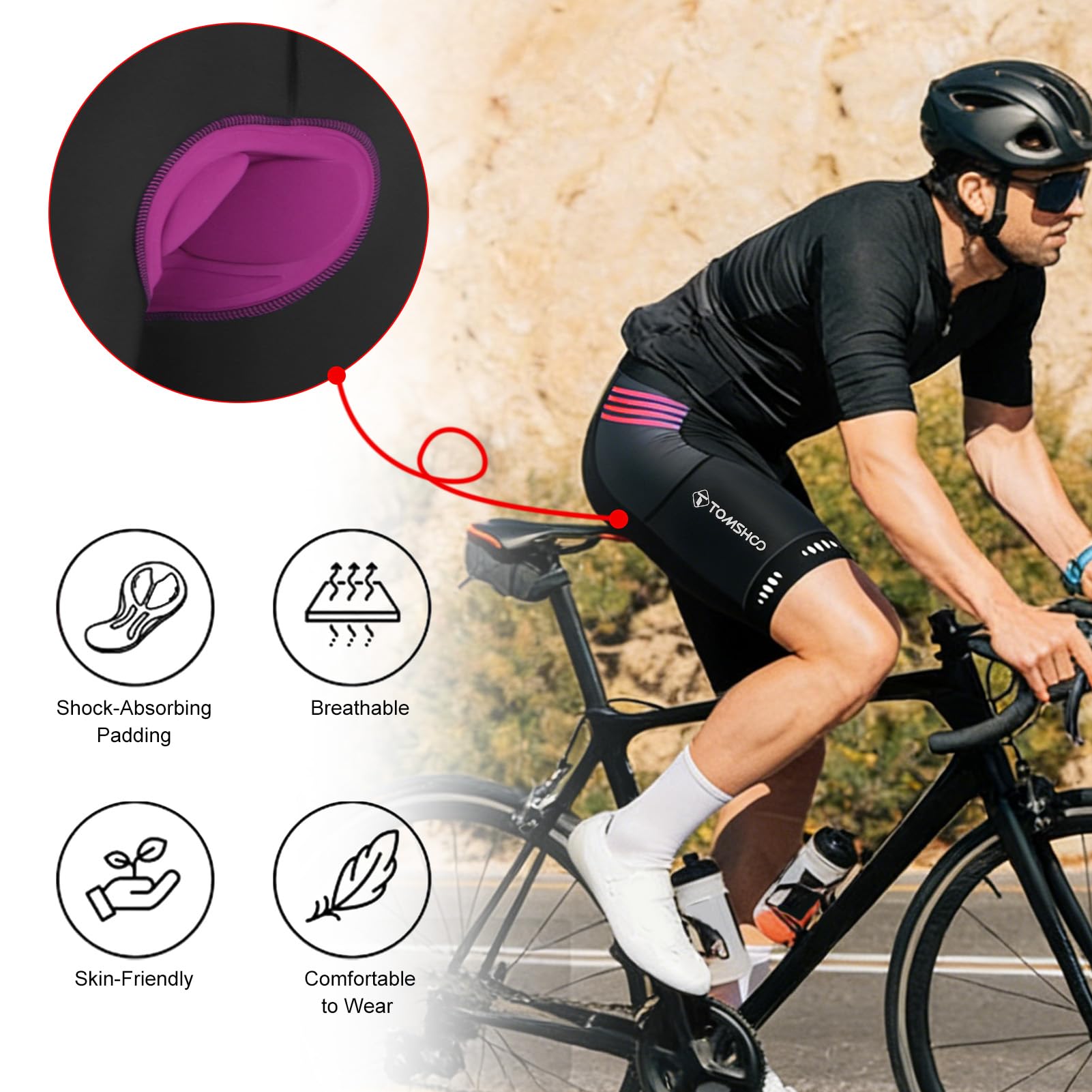 [MULTI-DIMENSIONAL SEAT PAD]: After many iterations, TOMSHOO cycling shorts' high-density foam pads effectively cover the human buttocks, reducing vibration while riding, providing strong support, and reducing the pressure on the buttocks caused by long hours of riding.