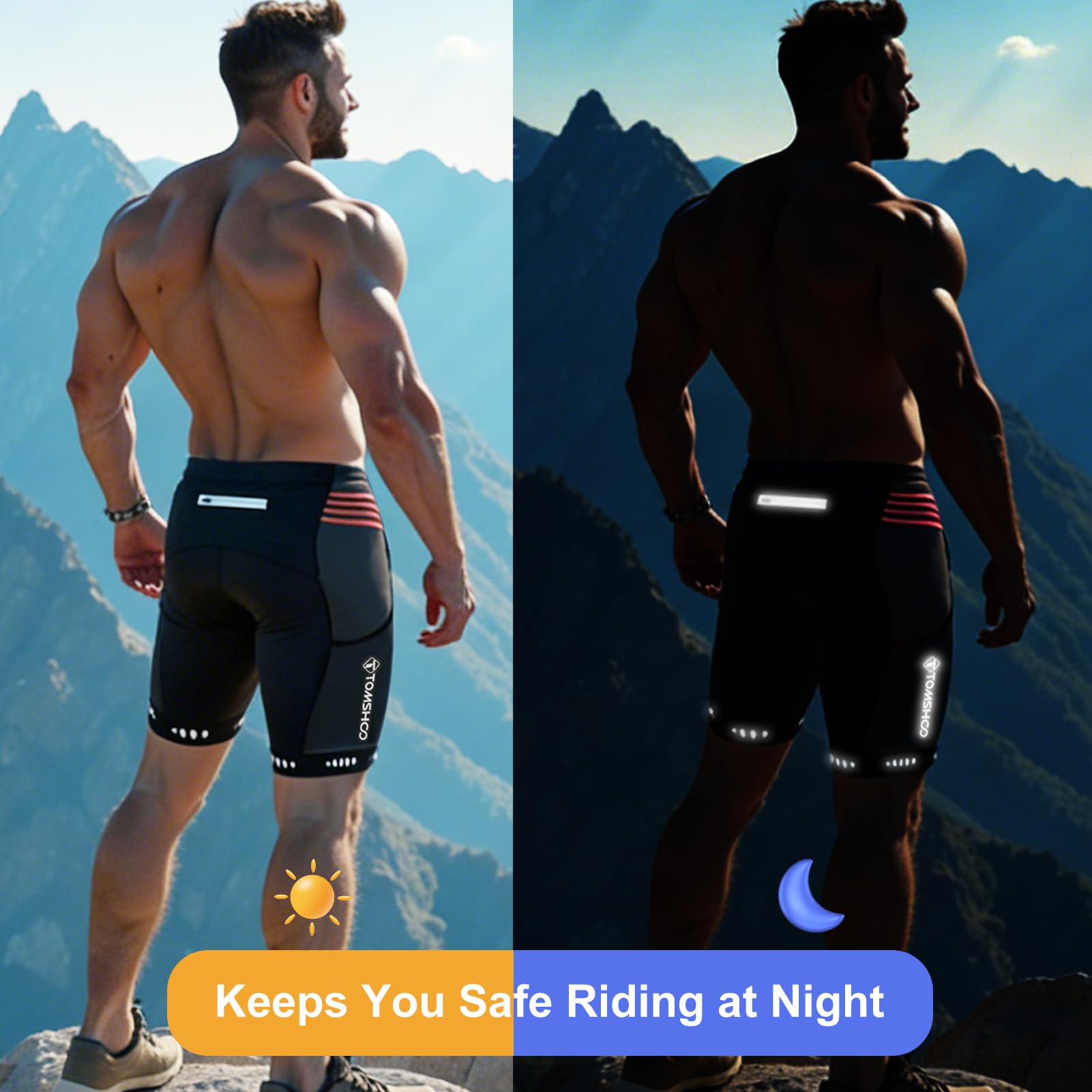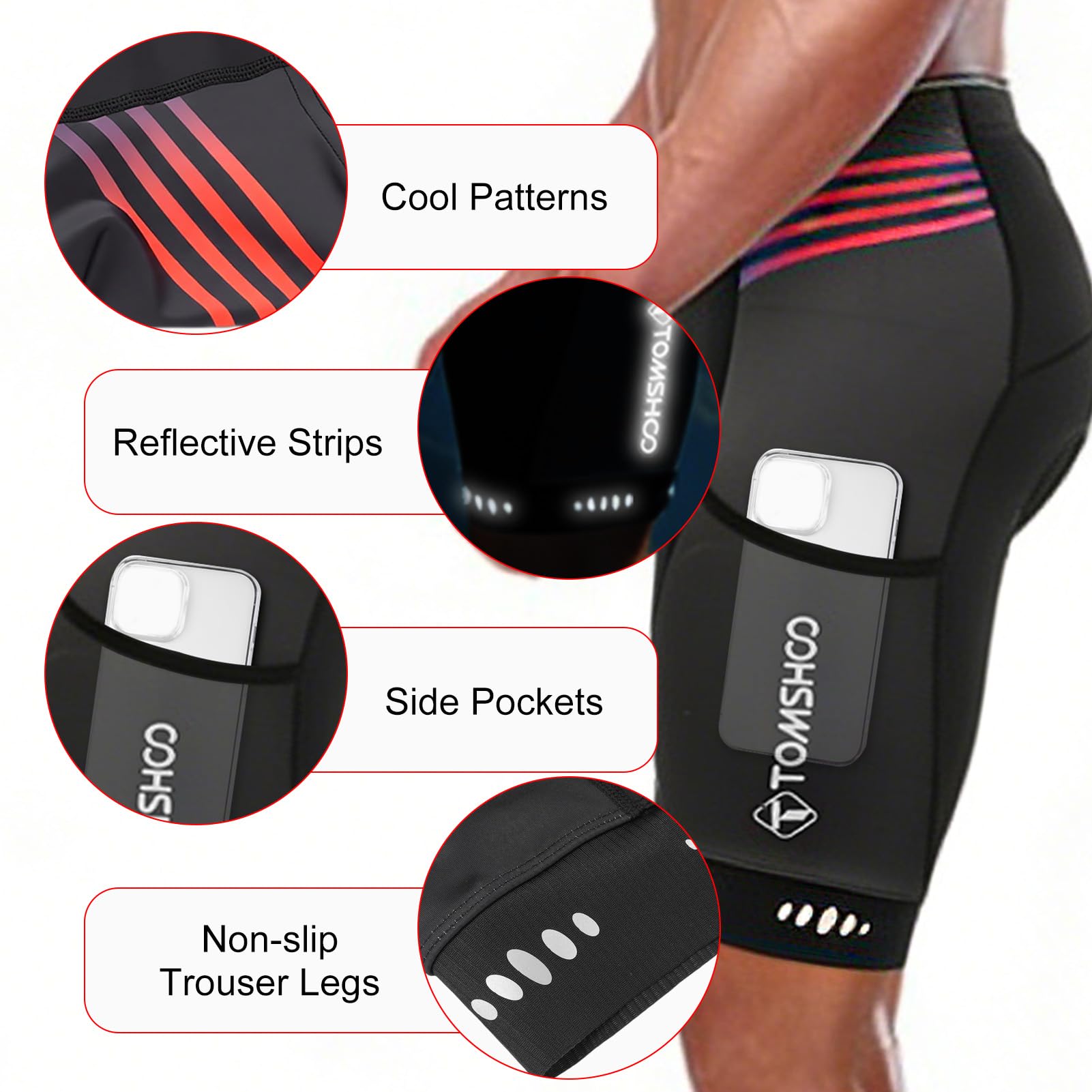 [FUNCTIONAL DESIGN]: The side and back pockets of the TOMSHOO cycling shorts provide plenty of space for storing and accessing small items, reflective strips on the back increase safety while riding, and silicone particles on the hem of the shorts ensure that your legs remain stable while riding.