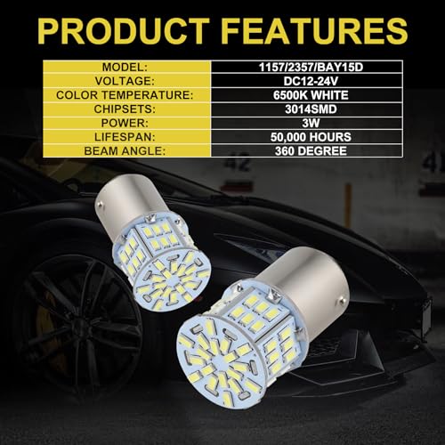 Key Specs: Voltage DC 12V-24V, 6500K Xenon White, Wattage 3w, low power consumption and fast heat dissipation for longer lifespan. The 1157 led light bulbs are compatible with BAY15D 2057 2357 7528 1016 1034 1035 1154 1493 1196 2397 3496 P21/5W etc.