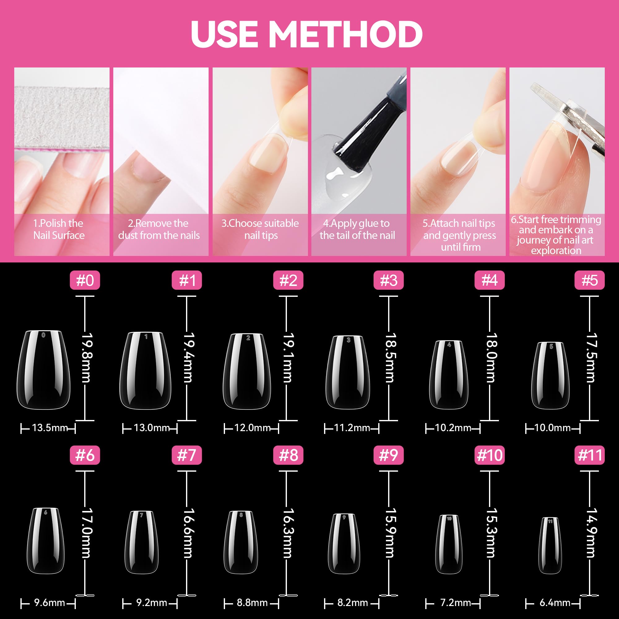❤️12 Sizes Available: Our coffin nail tips come in 12 sizes, with numbers on top for easy selection. We've even included two extra sizes to ensure a perfect fit for all nail beds.