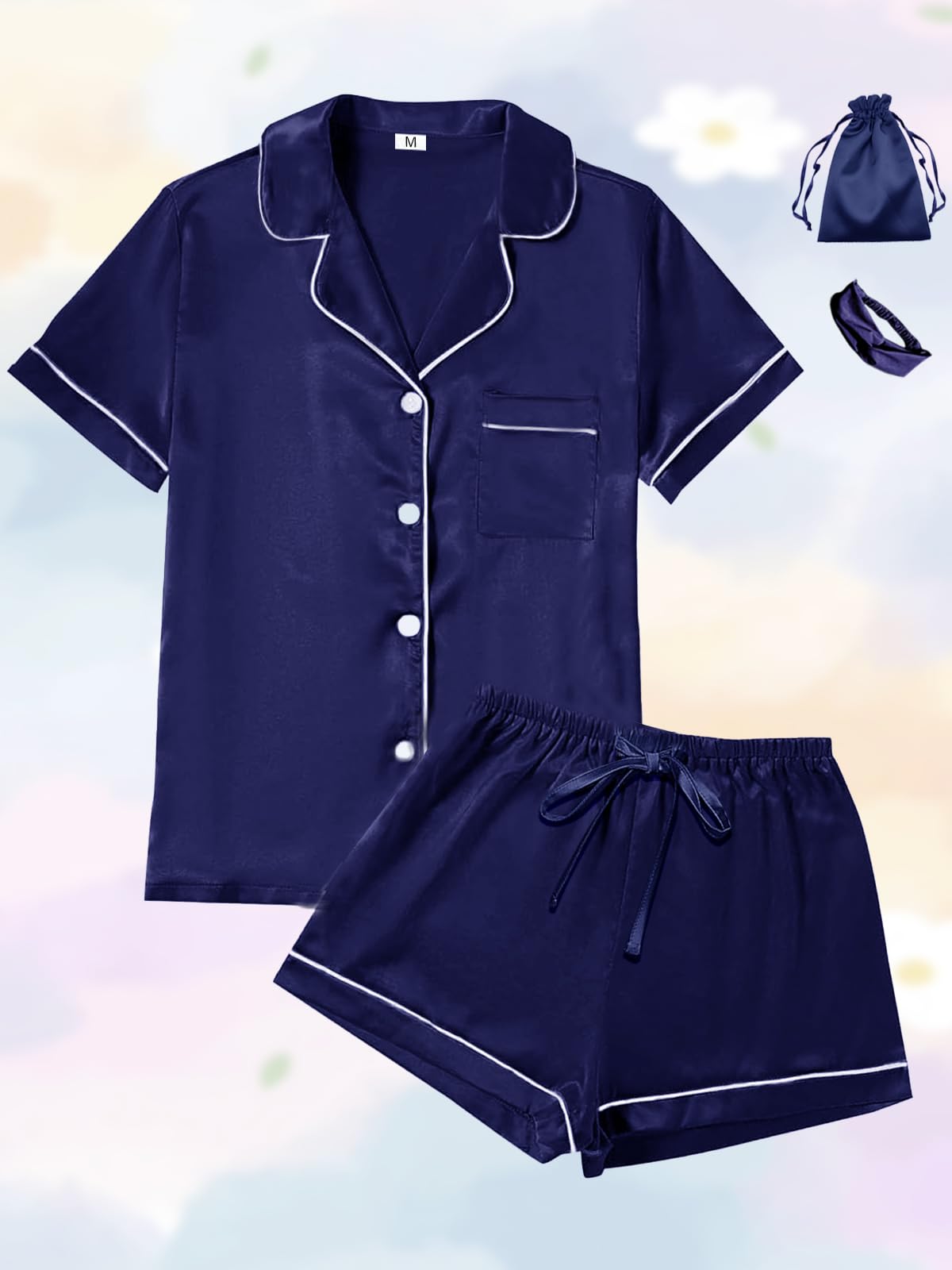 Perfect Combination-PLEASE NOTE the package contains:1xShort Sleeves Top, 1xShorts,1xHeadband, 1xPouch Bag =TOTAL 4PCS PER PACK. “W” = Piping in WHITE; “B” = Piping in BLACK. "A04"=Floral Pattern1.Also 8 SIZE RANGES: XS-S-M-L-XL-XXL-3XL-4XL.Please check carefully before order! This Womens Satin Pajama set shorts silk pajamas sets Pjs set sleepwear Pj sets Loungewear with headband + Pouch Bag has sufficient quantity and elegant soft quality to satisfy the needs of you.