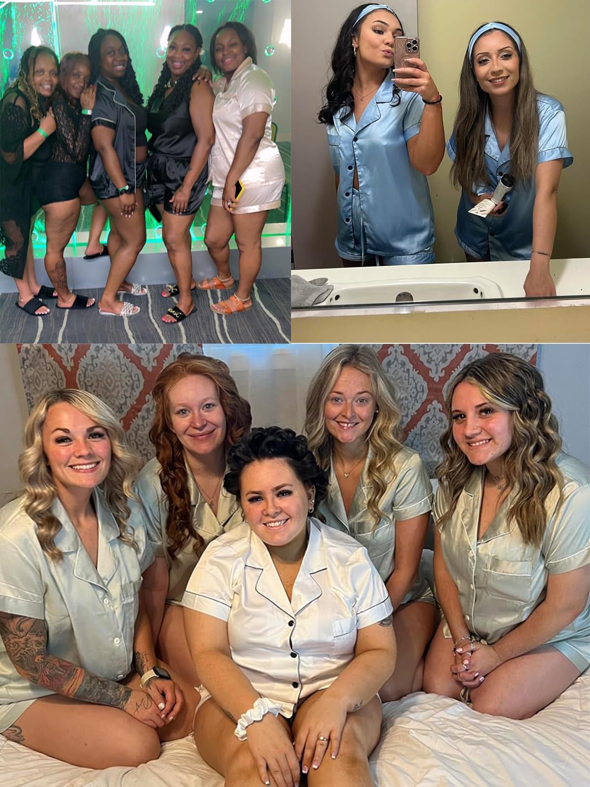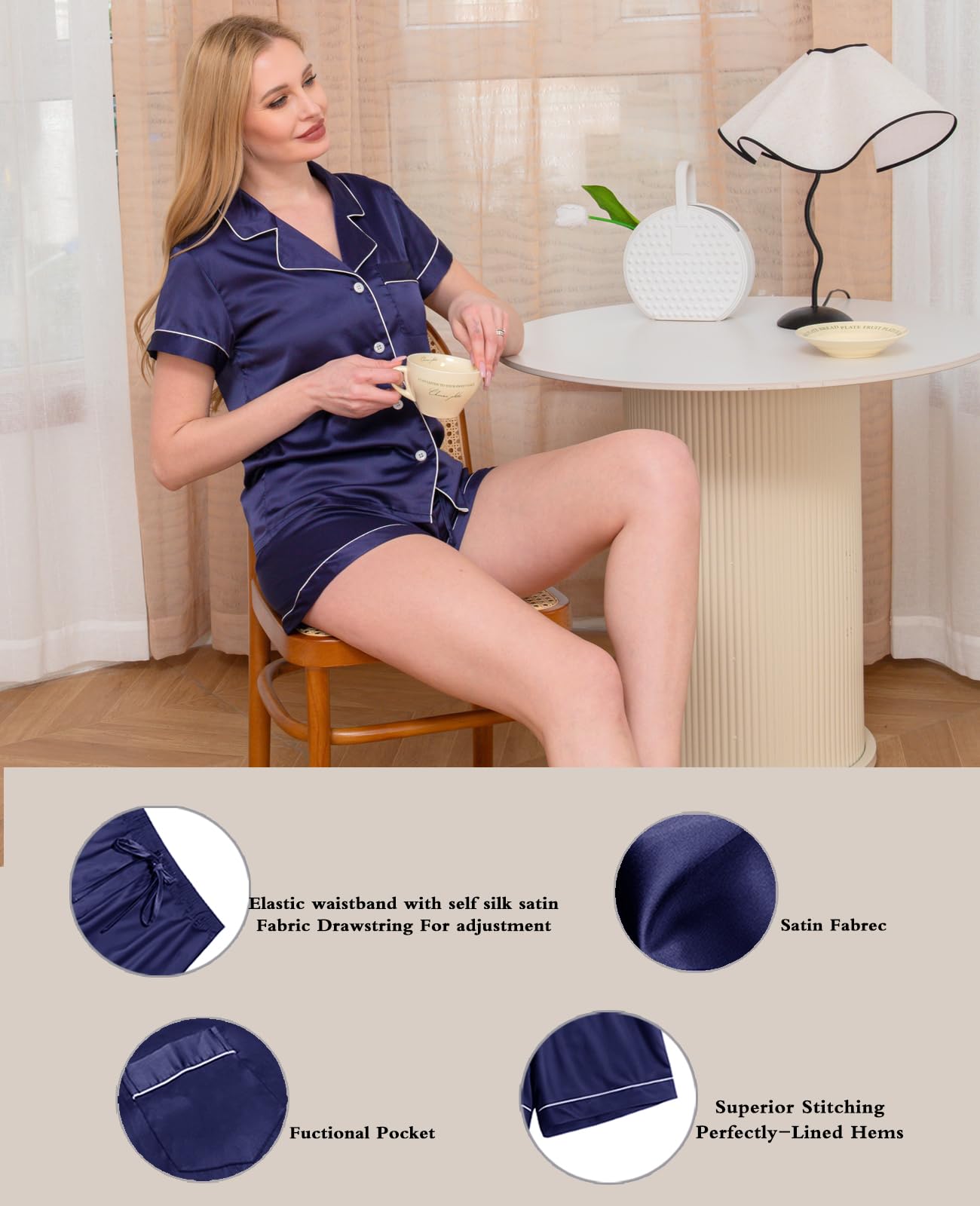 Product Features:Two Piece Pajama Set featuring classic sleepwear style.Short sleeve sleepwear top and pajama shorts set. Premium ultra soft silk satin material in very high quality and this sleep set with superior stitching and perfectly-lined hems. Breathable and Comfy sleepwear set. Wash Care: Hand wash separately in cold water is recommended.