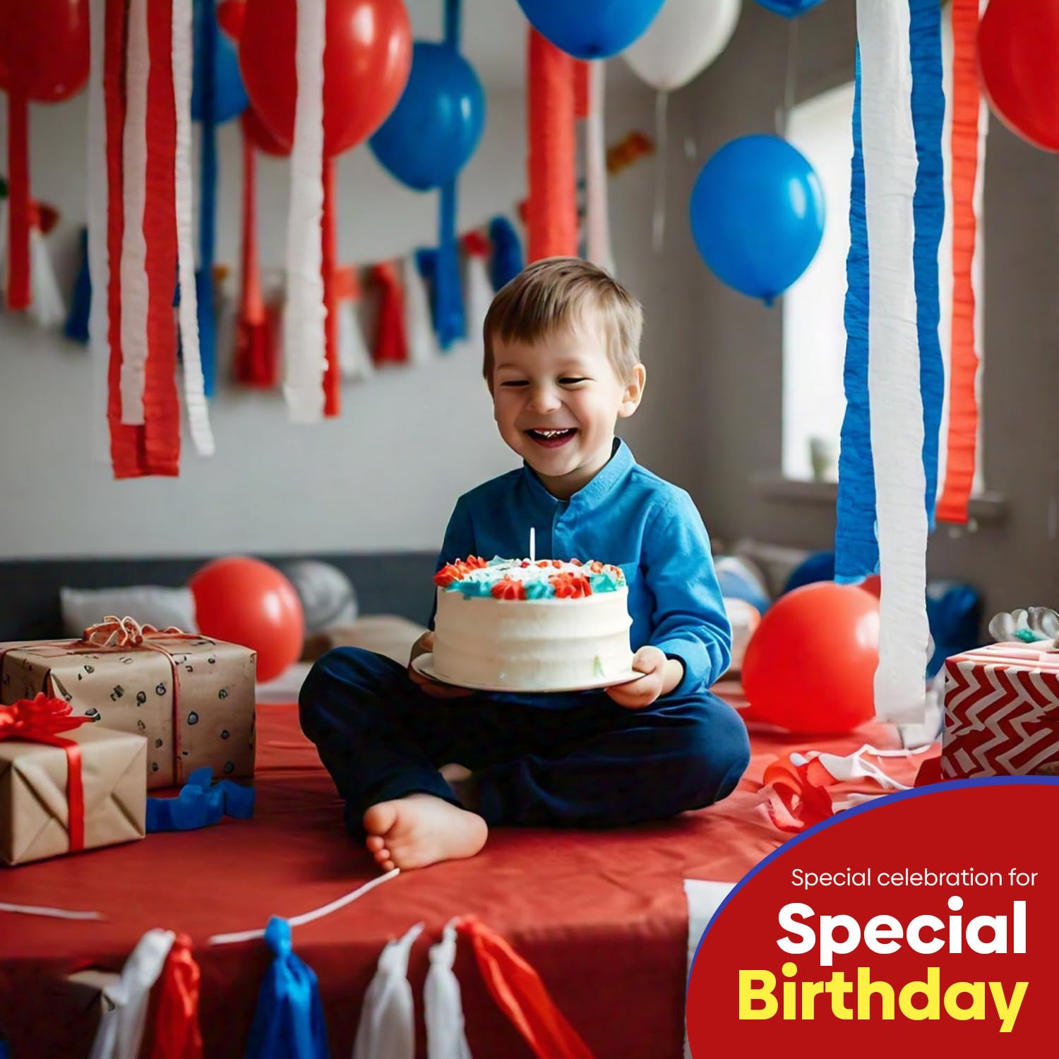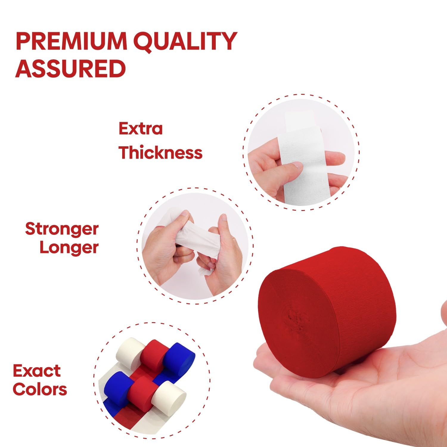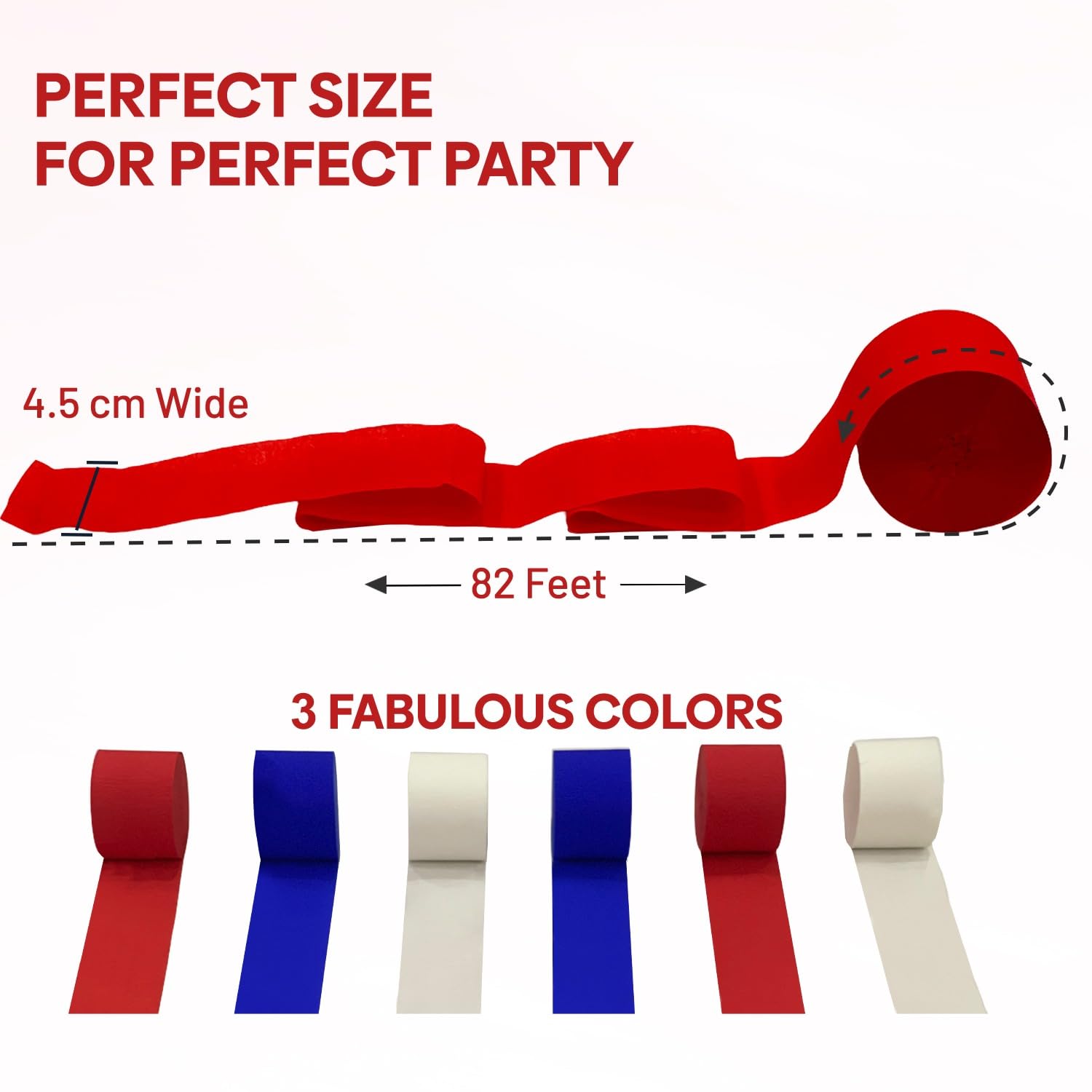 Vibrant Streamers Multipack: Our vibrant set of 6 crepe paper streamers, perfect for any festive decorations. Includes Fresh Red, Royal Blue and Bright White for various occasions such as birthday, red white blue themed party, 4th of July, super hero themed party. Each roll 82 ft long and 1.8" wide.