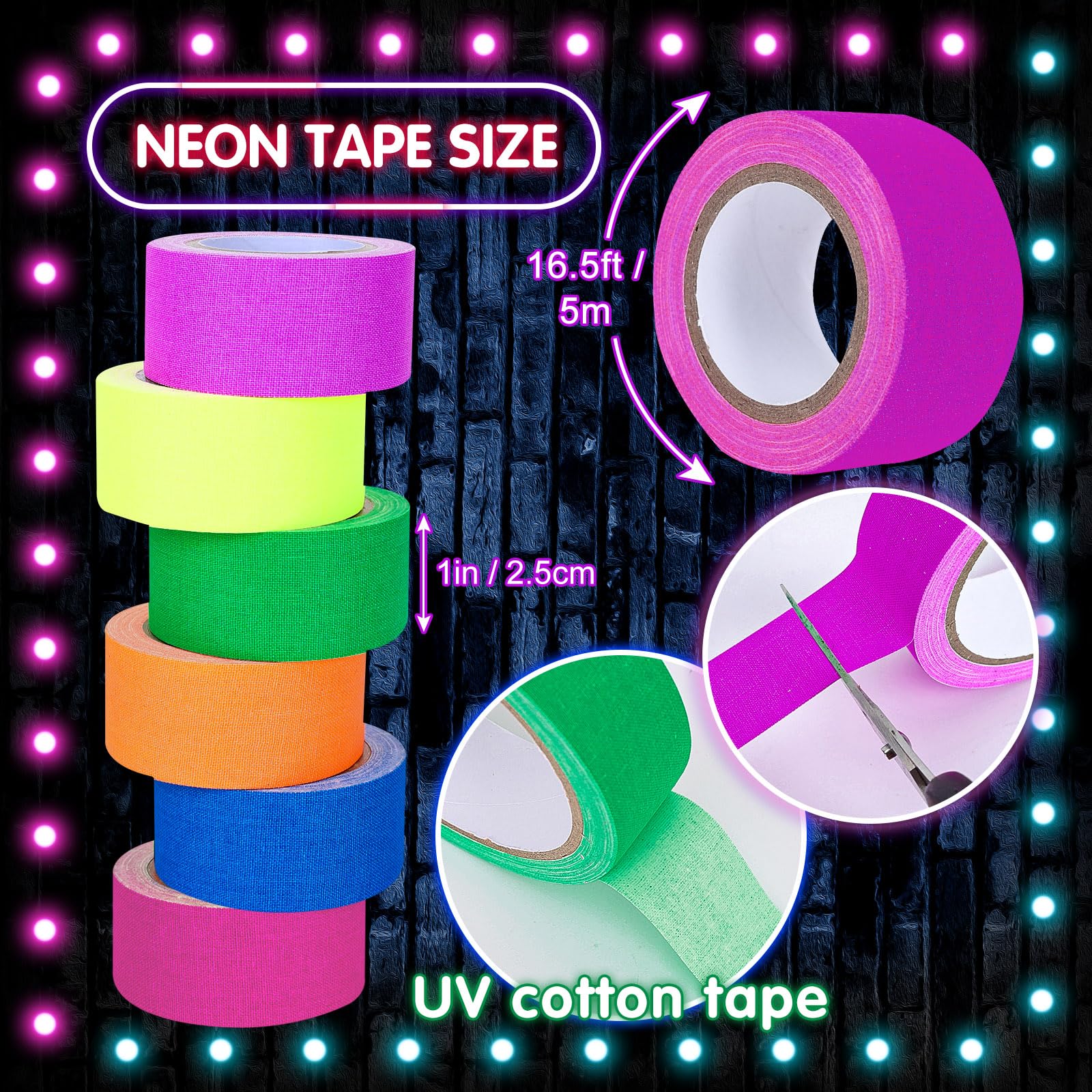 Pack of 6 – Each set includes 6 colors (blue, green, yellow, orange, pink, purple), glow in UV Light / Blacklight, the neon tape doesn't glow itself, but just react amazing under UV light or blacklights
