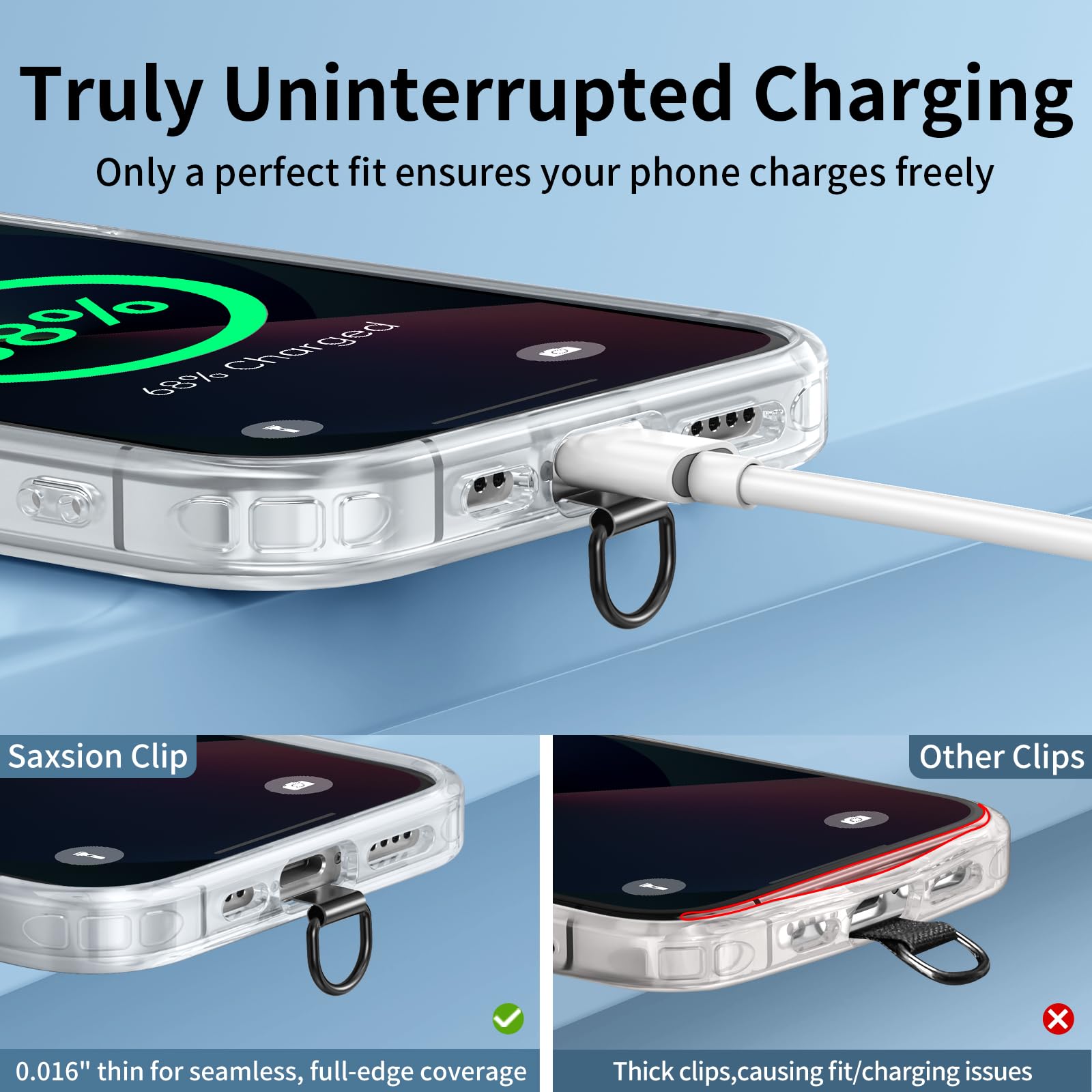 【Tool-Free, Residue-Free Phone Lanyard Installation】 Install this phone lanyard attachment in seconds—no tools or messy adhesives. Simply thread the tab for phone lanyard through your case's charging port, insert your phone, and clip on your strap. It removes cleanly without residue, making it easy to switch cases.