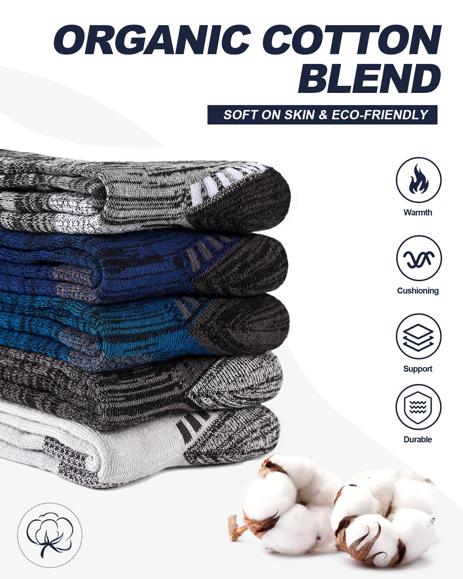 Mens Cotton Boot Crew Socks, 5 Pairs Full Cushion Socks Moisture-Wicking & Reinforced for Work Hiking Walking Outdoor