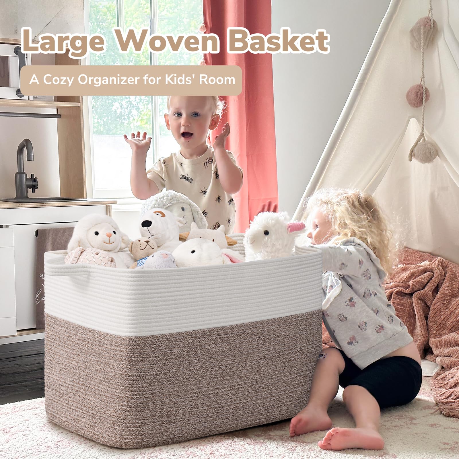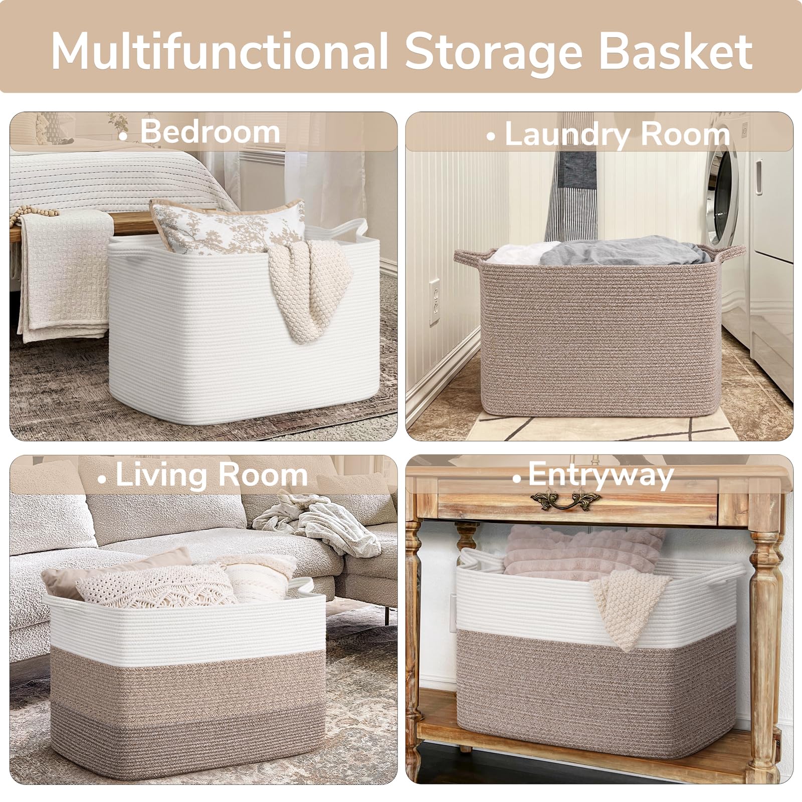 Large Capacity: 25"L x 16"W x 16"H, this large rectangle basket with 105L capacity is perfect for storing throw blankets, pillow, cushions, clothes, towels and stuffed animals