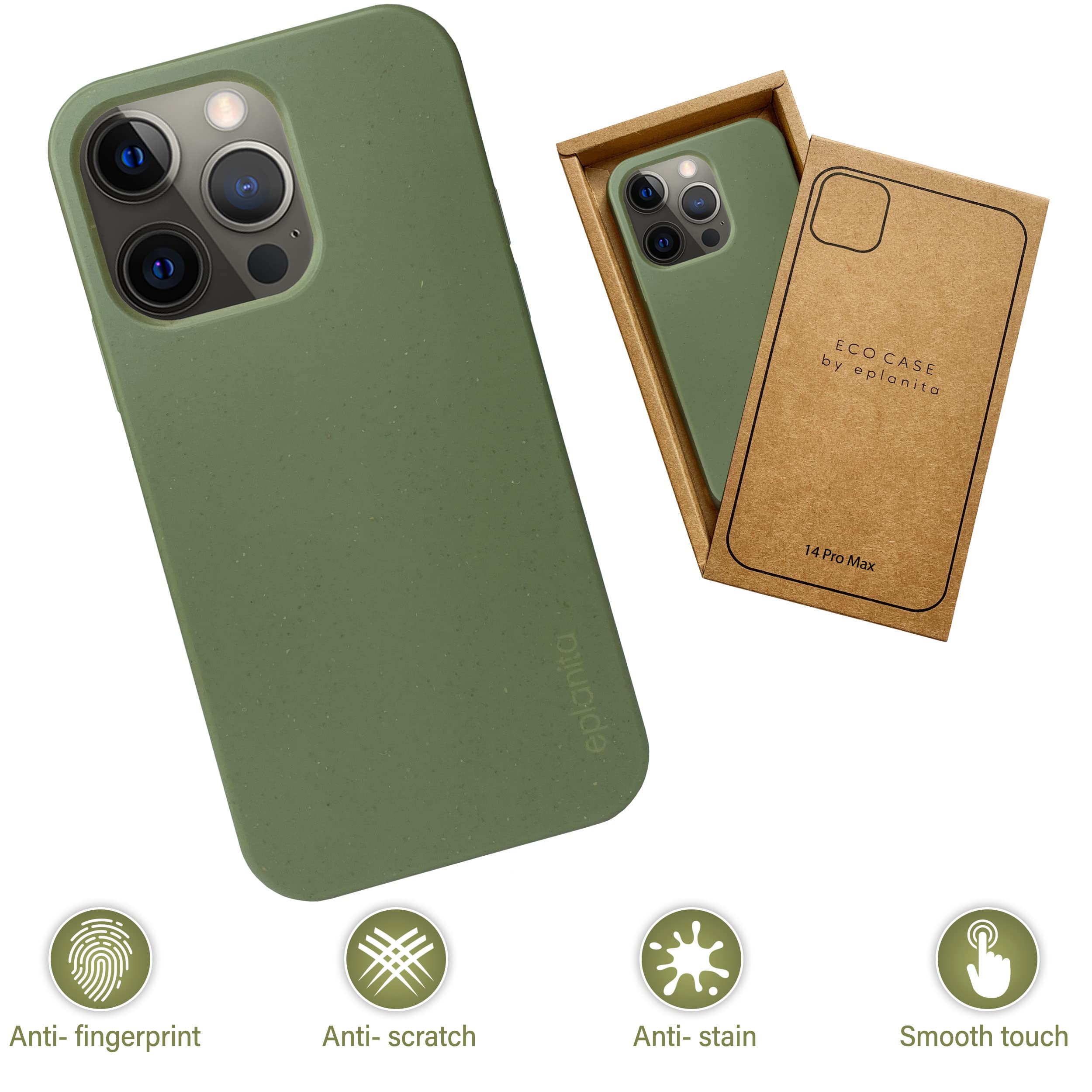 🌍 PROTECT YOUR PHONE AND THE PLANET: Mobile phone case by eplanita for iPhone 14 Pro Max is made from wheat straw and soft TPU. This combination makes the cell phone case kinder to the environment.