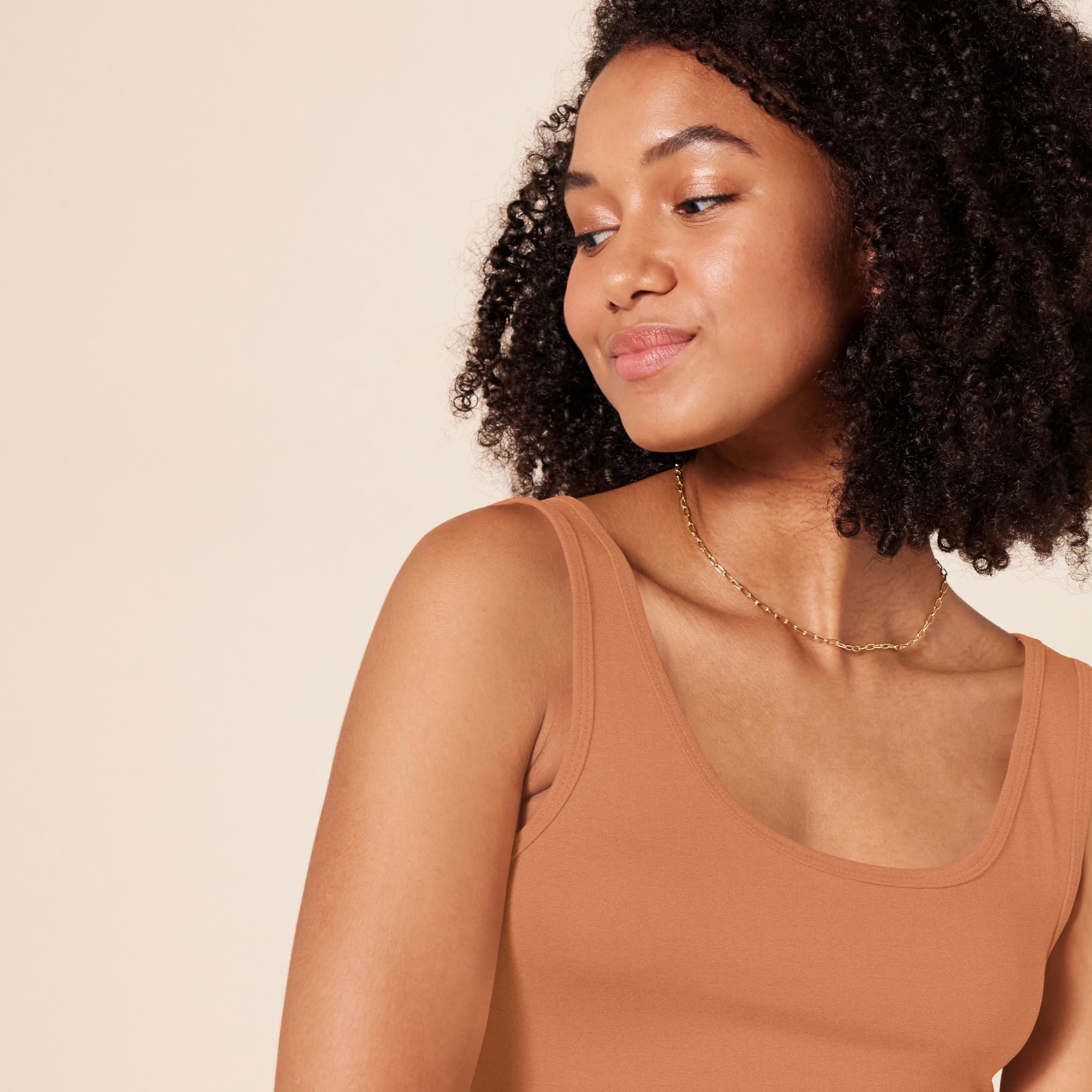 DETAILS: Features an open scoop neckline, thin tank straps, and double needle stitching for durability.