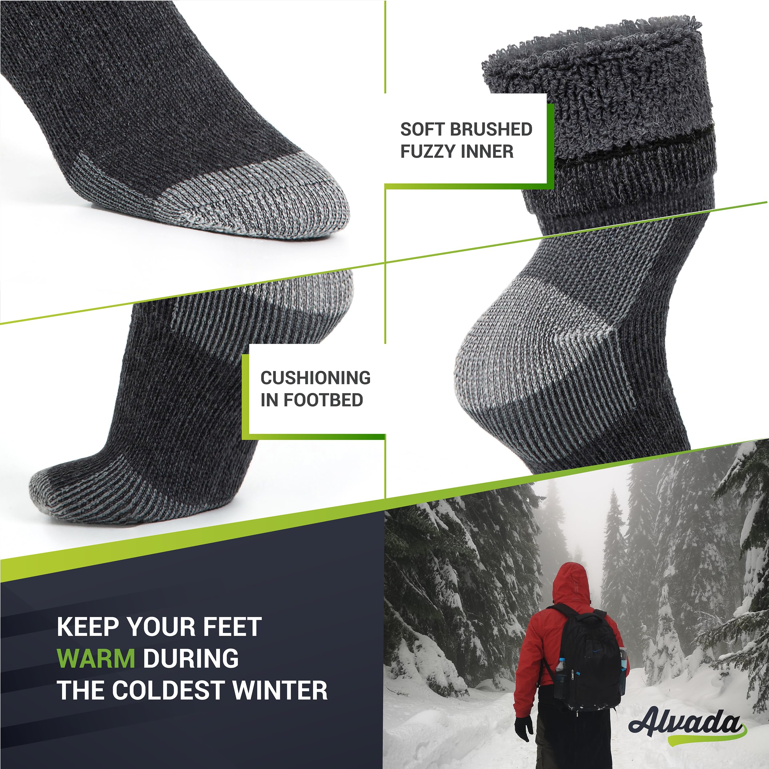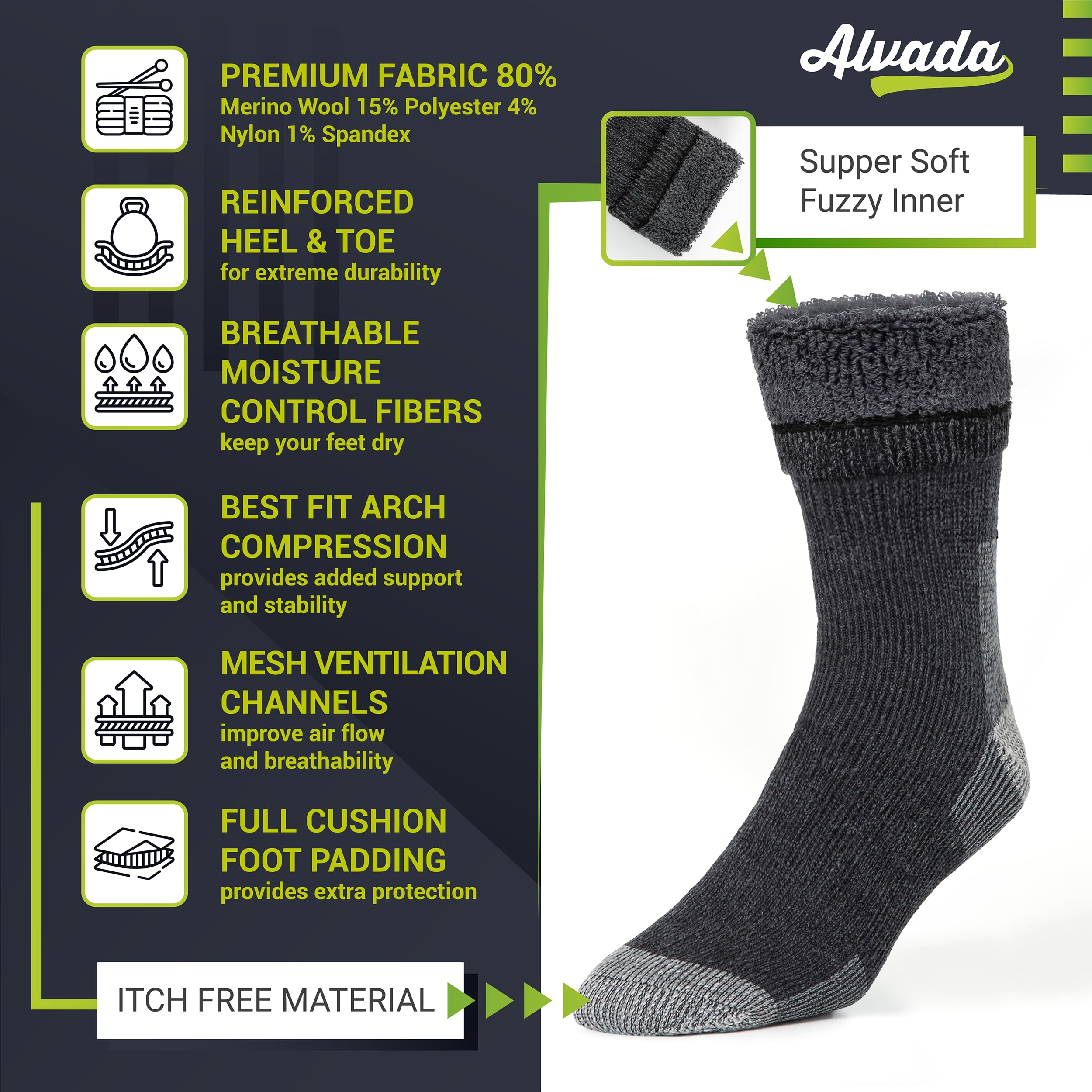 FEATHER-SOFT COZY SOCKS - With a super soft, feather-like touch and cozy design, Alvada merino wool hiking socks will keep your toes warm and toasty even during the coldest winter chill, while protecting your feet from shoe bites and cushioning them from impact. Designed to help you perform your best all day long, these thermal socks will protect your feet from getting tired and are a must-have for everyone who values comfort!
