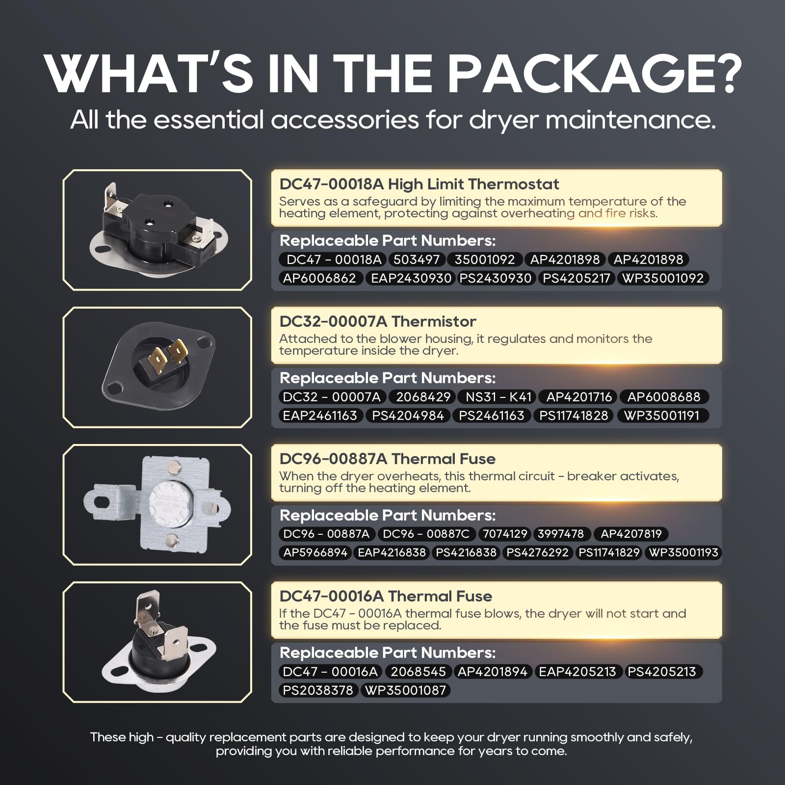 All-In-One Repair Kit: TOPDC offers a comprehensive 5 - piece dryer repair kit. This set includes a DC47-00019A dryer heating element, a DC47-00018A high limit thermostat, a DC32-00007A thermistor, a DC96-00887A thermal fuse, and a DC47-00016A thermal fuse. You can easily fix common dryer problems such as no heat or not enough heat, takes too long to dry clothes, shuts off too soon, and timer not advancing