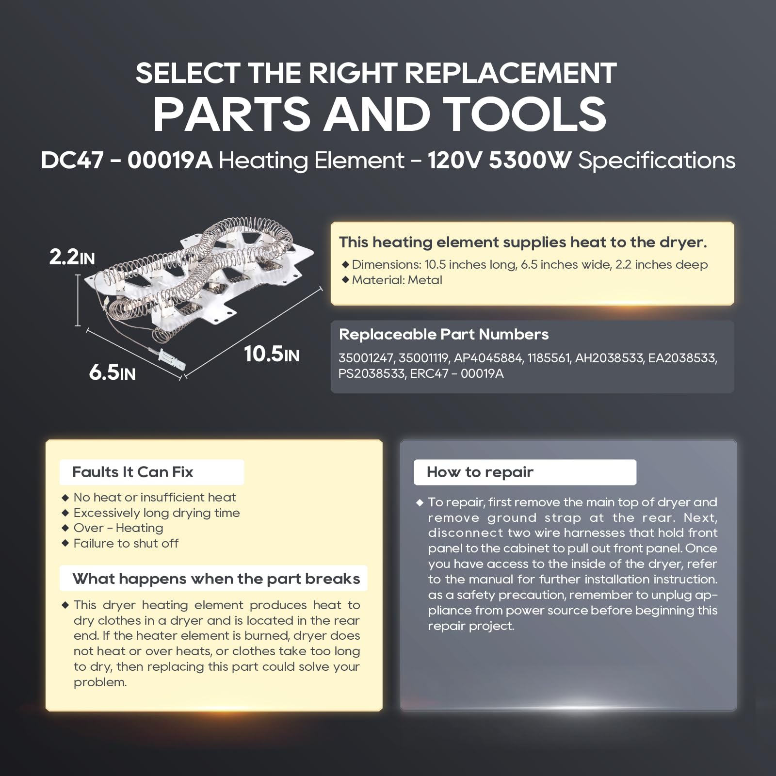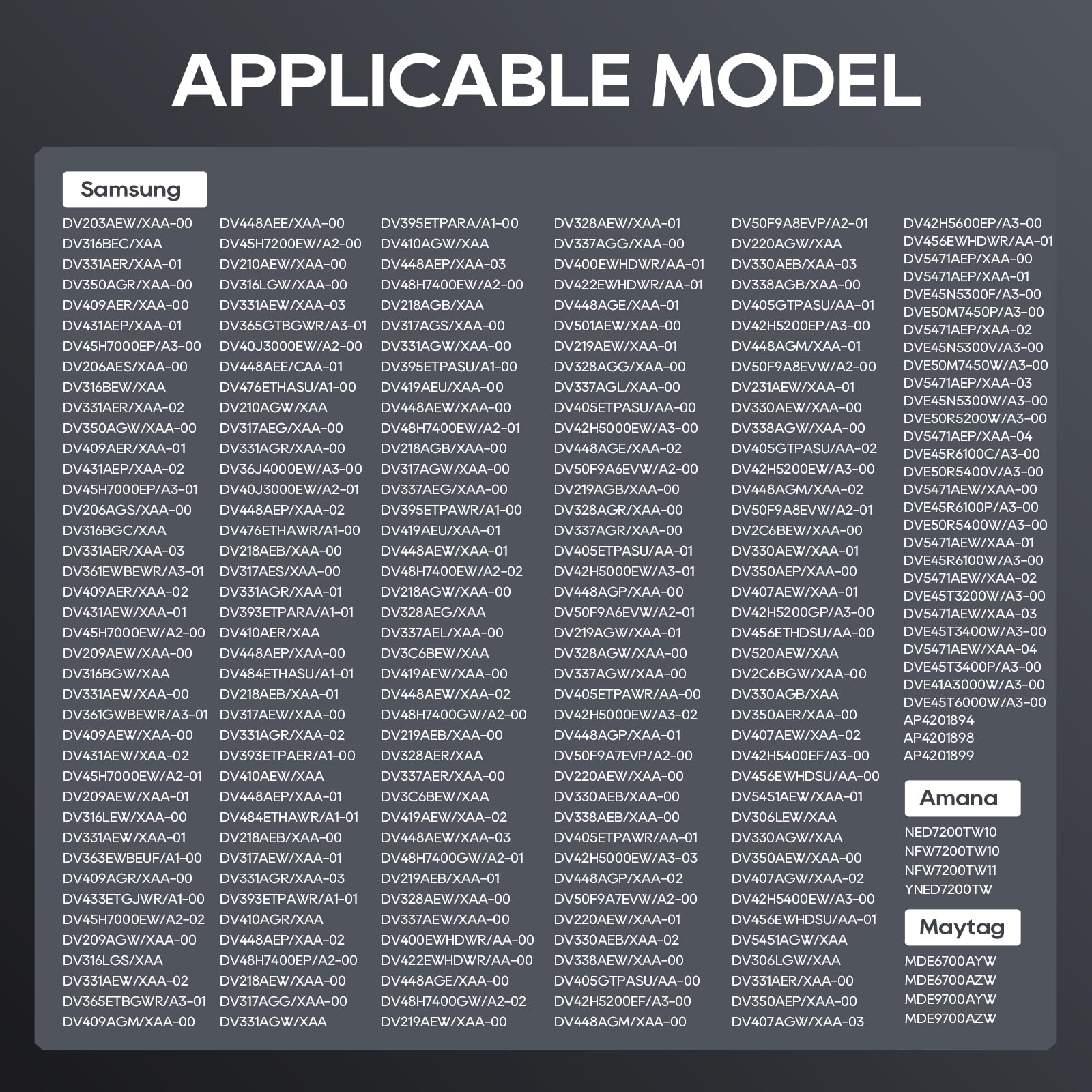Wide Compatibility & Universal Fit: DC47-00019A dryer heating element is compatible with Samsung DV45H7000EW/A2 DVE50R5200W/A3 DV40J3000EW/A2 DV42H5000EW/A3 DVE50M7450W/A3 DV42H5200EW/A3 DV48H7400EW/A2 DVE50R5400V/A3 DV42H5200EP/A3,LG, Maytag,Kenmore,Kitchen-aid and Roper. Directly Replaces the following Part #'s: AP4045884, AP4201898, AP4201899, 35001119, 1185561, DC68-03784D-08, ERDC47-00019A