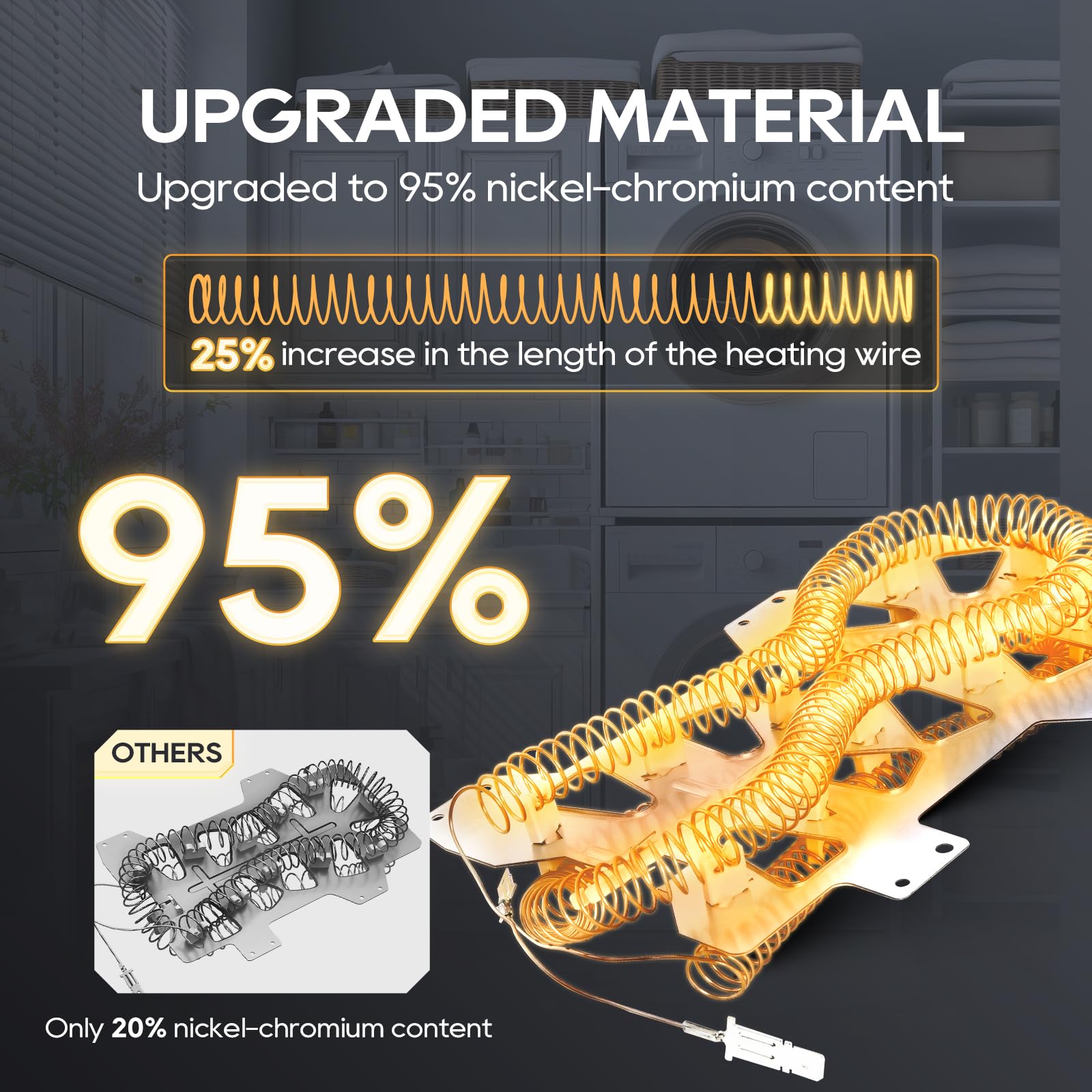 Premium Heating Element: TOPDC's 2025 upgraded dryer heating element. With 95% nickel - chromium, it's highly heat & abrasion - resistant. The heating wire, 25% longer than other common dryer replacement parts, ensures even heating, a longer lifespan, and protects clothes. Meets OEM standards for reliable performance